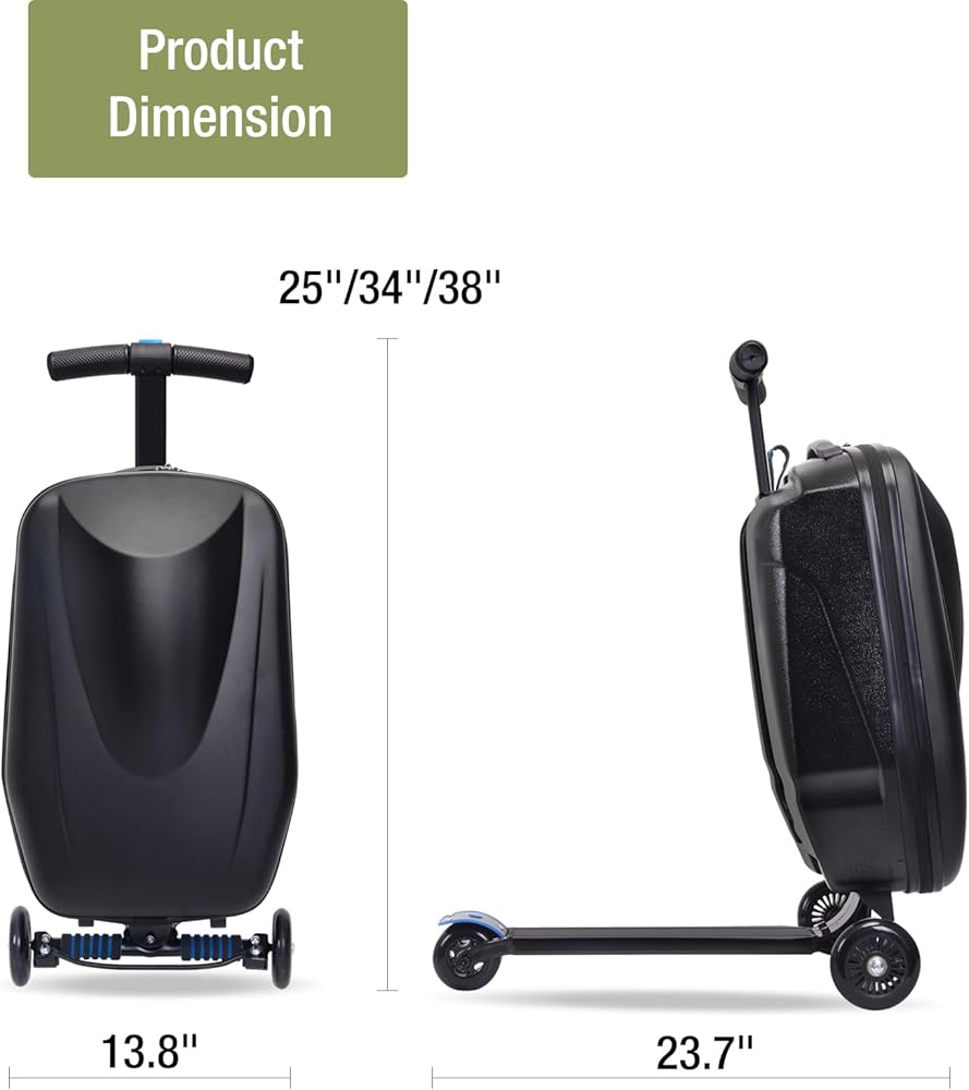 【Roomy Capacity & Compartment】The size of the suitcase is 51cm/20inch*29cm/14inch *21cm/8.3inch, it is made of water-resistant and anti- scratch PC, the capacity is about 22Liters with a mesh compartment, can perfectly fit clothes,toys, books and snacks 【Steering & Braking Control】The scooter has two wheels at the front, which can keep balance when riding, and can easily turn left and right, control direction. And there is a brake pedal a the end of the base, one foot to stop riding 【2 Handle Height Option】The height of the aluminum handle can be adjusted, 70cm/27.5inch or 80cm/31.5inch two options, just press the red buttom, it is practical and comfortable for most kids at different age and height 【Made for Kids】This scooter luggage is designed for kids, it's Max loading weight is 65kg/145LB, Slip-proof standing deck and handle bar to ensure safe scooting, it is a good choice for the kids age 4-15years old 【How to fold scooter】1. Step on the pedal; 2. Hoild the handle; 3. Push the lever forward and press the black button firmly at the same time.