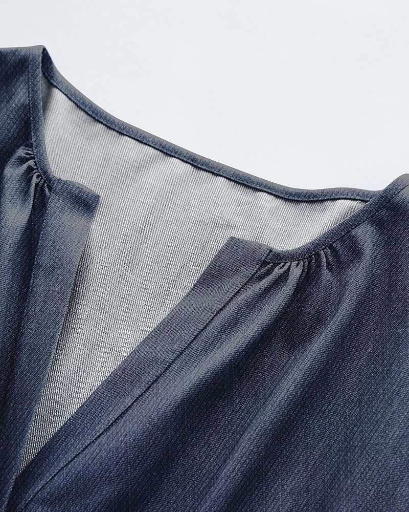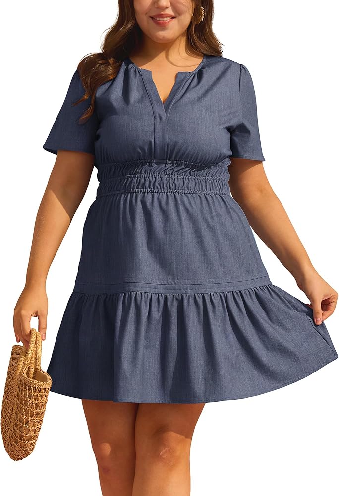 Design Highlights:This stunning chambray dress features a flattering three-tiered silhouette with a gathered ruffle hem, adding movement and a touch of flair. The short sleeves and split V-neckline make it ideal for casual outings, brunches, or summer gatherings. Easy to slip on and off, the dress is enhanced with feminine gathering details at the neckline and waist, creating a flattering and chic look.