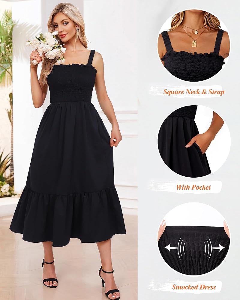 【Flattering Square Neck & Stretchy Wide Straps】Fall in love with the feminine square neck that beautifully frames your collarbones without being too revealing. The wide, non-slip straps stay perfectly in place. The elasticized bust provides just the right amount of support. The open back adds a touch of romantic allure while remaining tasteful enough for family gatherings. Whether you're petite or tall, this summer dresses ensures a perfect fit that flatters your unique shape
