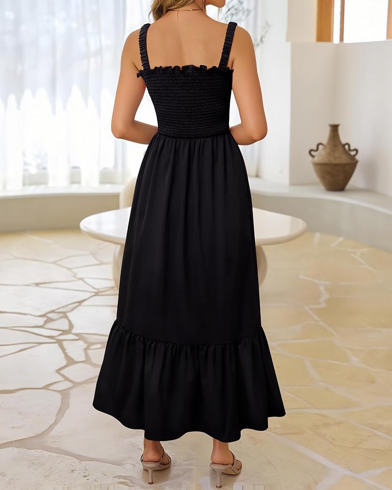 【Flowy & Feminine Bohe Maxi Dress for Summer】Slip into summer with this effortlessly chic womens boho maxi dress featuring a flattering A-line silhouette that skims your curves beautifully. The stretchy smocked dress provides a customizable fit for all body types, with its romantic square neckline and wide straps, this long dress offers both comfort and style. The delicate ruffle hem adds playful movement perfect for beach walks or summer party