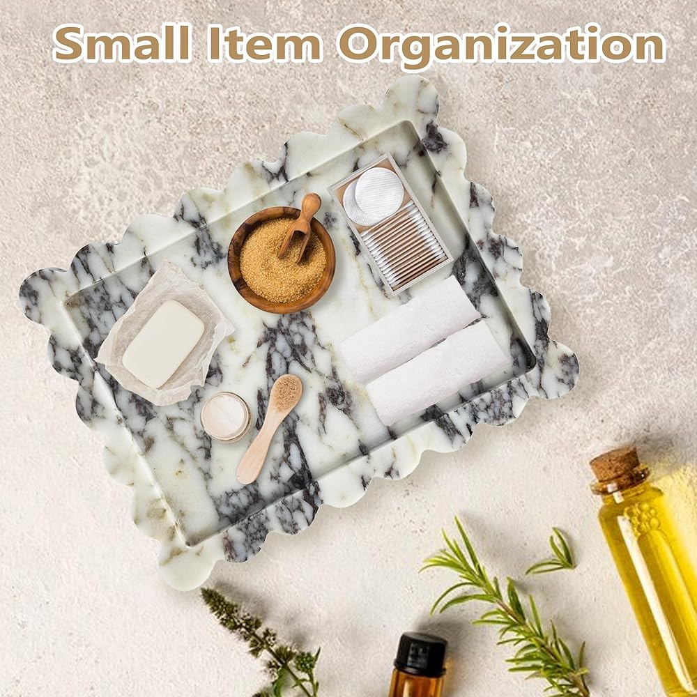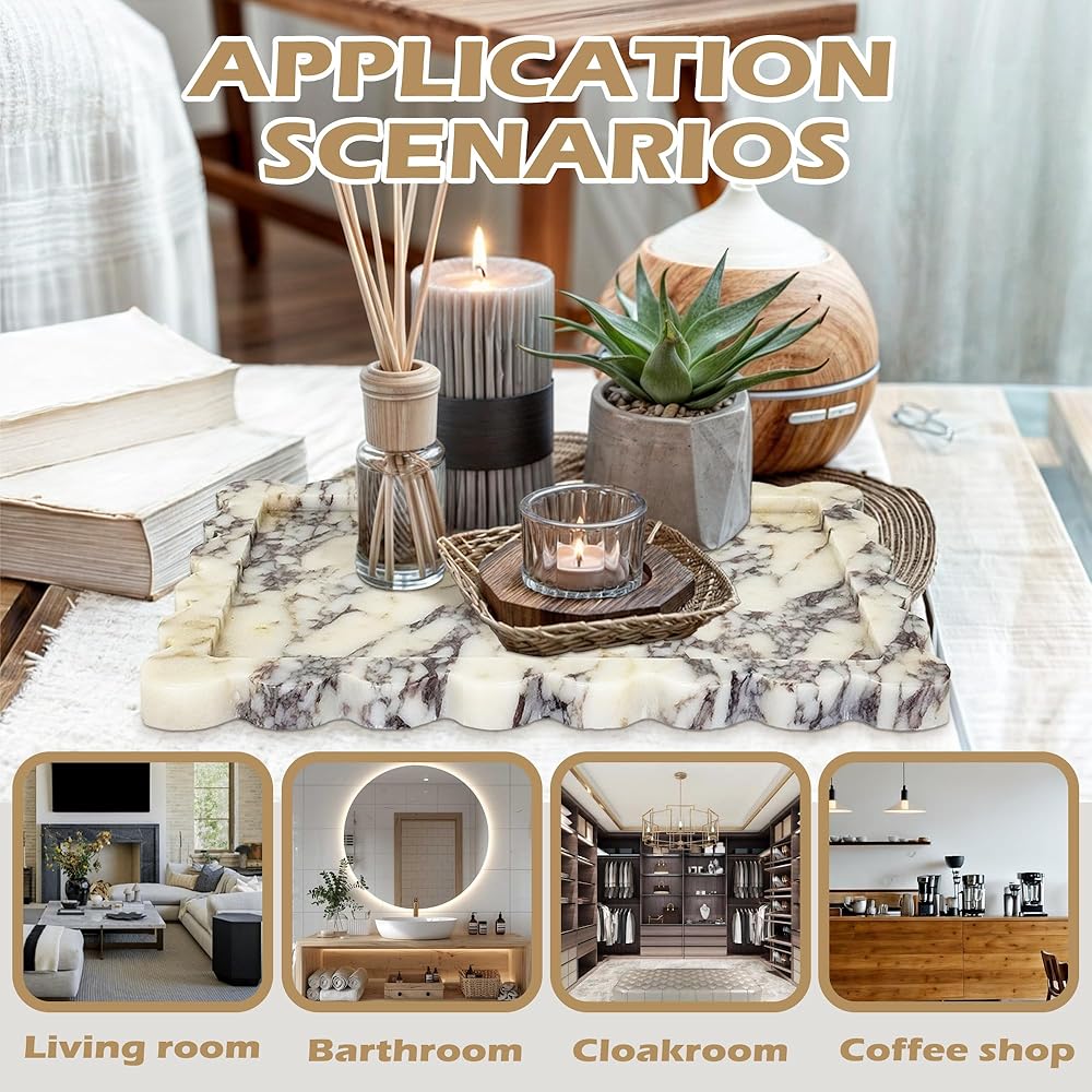 【Versatile Design for Multiple Uses】Measuring 12 x 9 x 0.7 inches, this marble tray is perfect for a variety of functions. Use it to display jewelry, candles, and perfumes on your vanity, organize spices or serve appetizers in the kitchen, or showcase decorative items like candles and plants in the living room. It's also ideal for keeping bath essentials neatly arranged in the bathroom or adding a sophisticated touch to your office space.