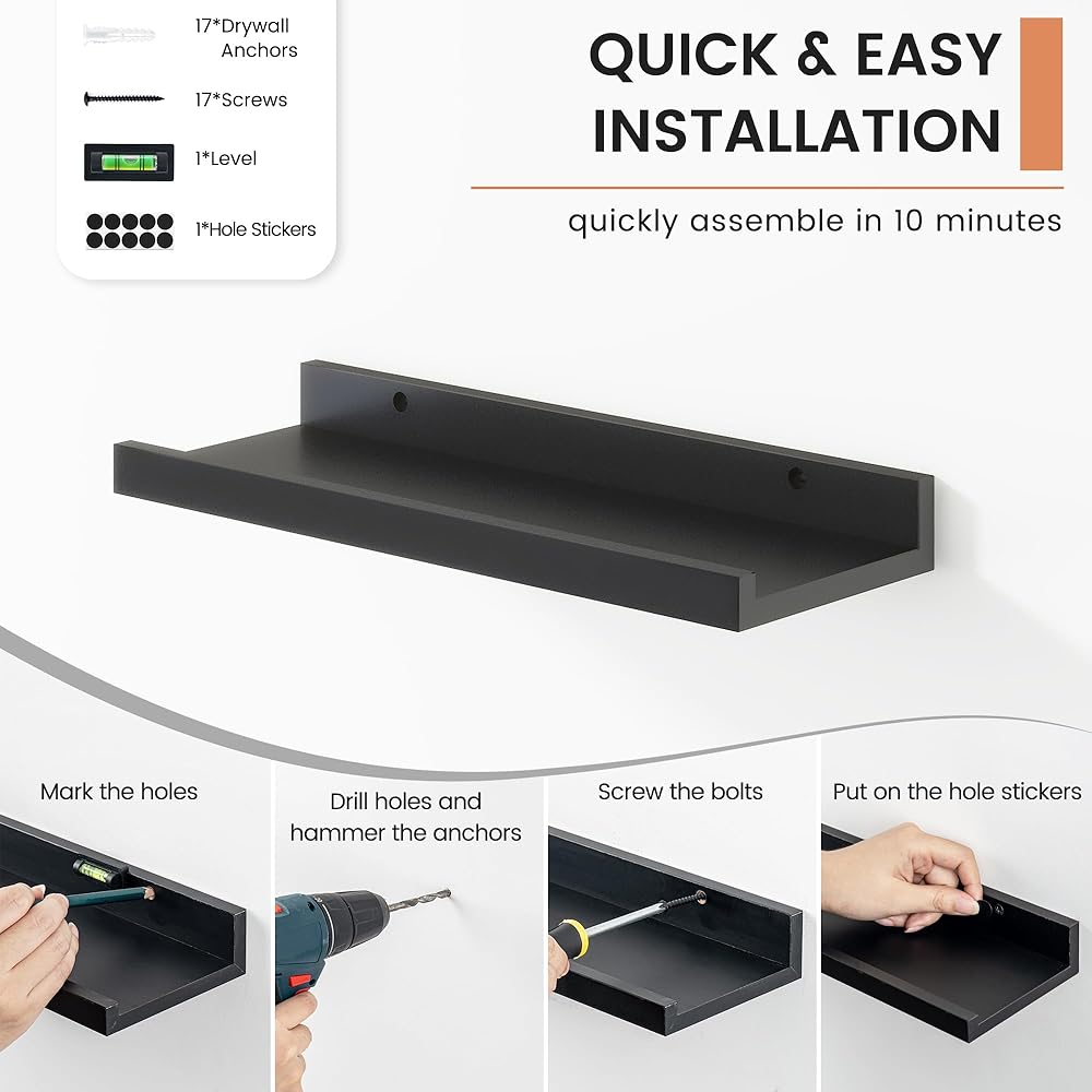 【Easy to Install】FLYJOE picture ledge shelves are quick and easy to install! Each set comes with pre-drilled holes and all necessary hardware, including a mini level for perfect alignment. With simple instructions, you can have your shelves up in minutes, allowing you to start decorating right away
