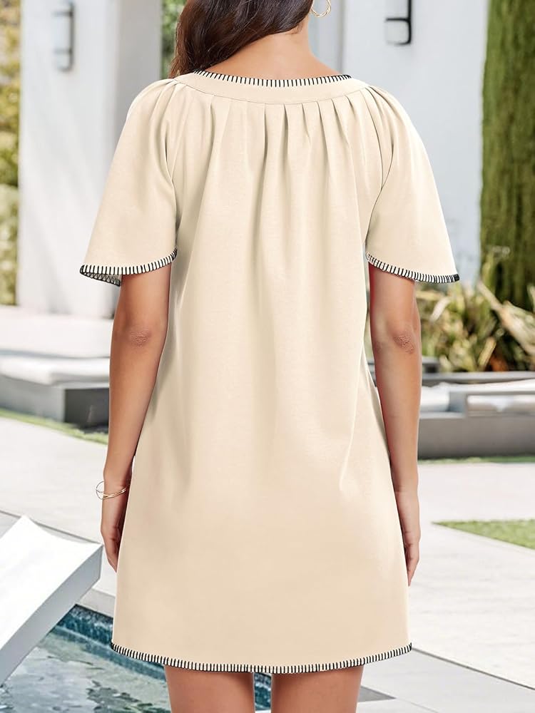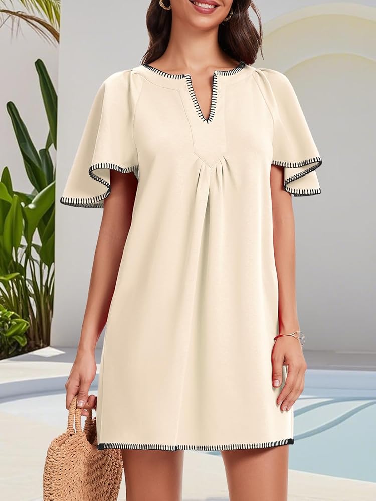 Features: Short sleeve, flutter sleeve, chic pleated detail, v neck, contrast trim, a-line, two side pockets, ruffle sleeve summer short dress, short sleeve contrast trim mini dress, loose fit a-line shift dress, 2025 mini beach dress,summer party wear dress, short boho vacation dress, babydoll mini dress, short shift dress, 2025 trendy clothes
