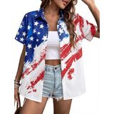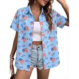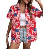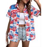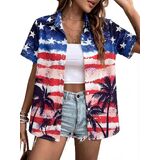 Design: America flag shirt, Women's 4th of July outfit, USA flag t shirt, funny red white blue graphic tee, Independence Day Gift Top, women hawaiian shirts, patriotic button down shirts, summer short sleeve, lightweight. The shirt combines the classic stars and stripes with a tropical floral design, giving it a unique Hawaii-inspired twist for a fun and festive look.