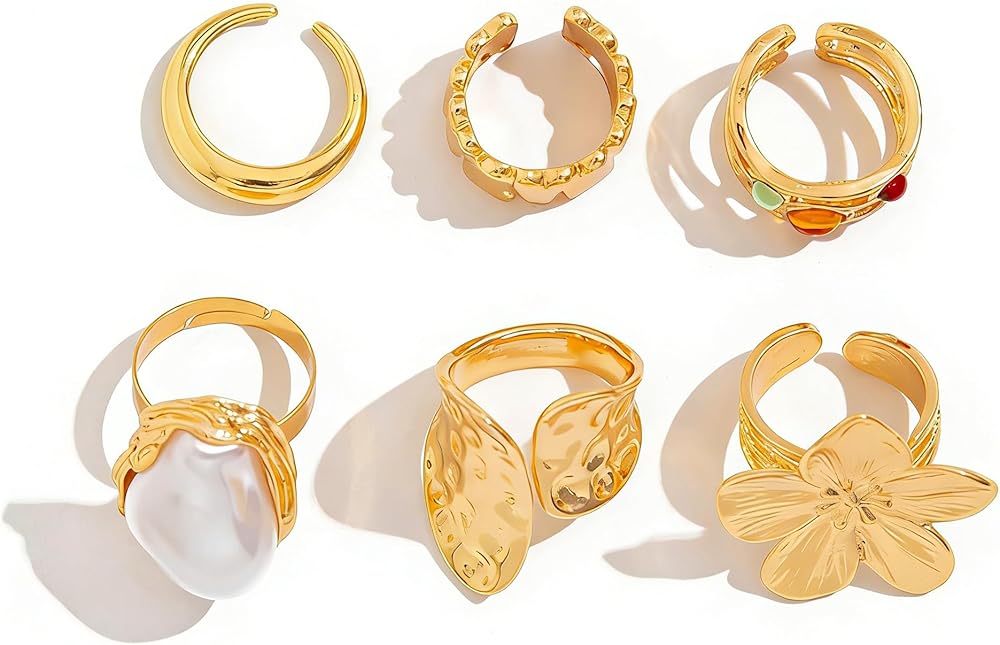 Gold Ring Set: Comes with 6 pcs cute gold rings. each Gold ring has a unique design that's great for anyone, you can combine them to create a lot of fashionable ring combinations to match different clothes