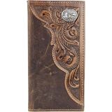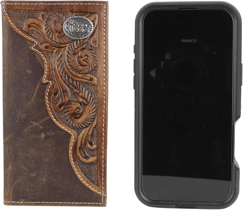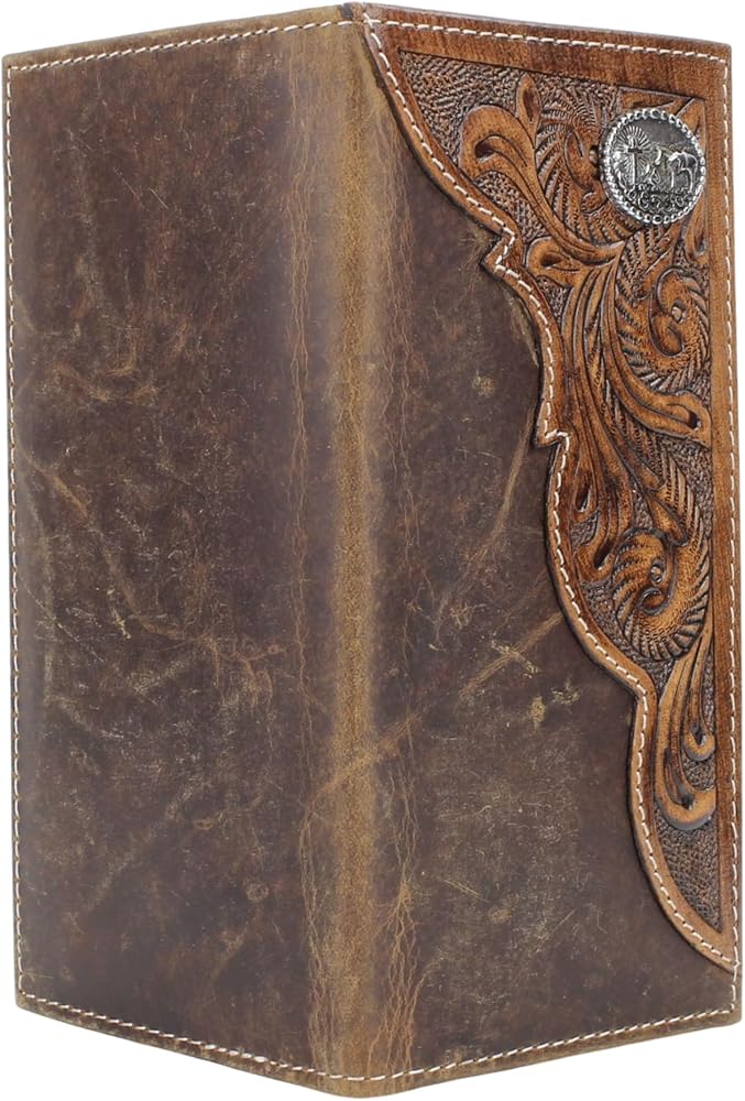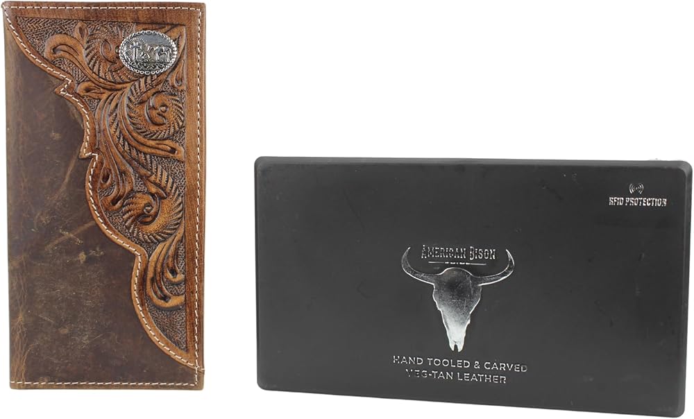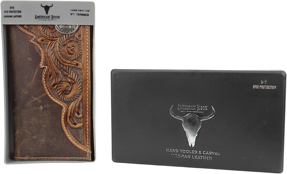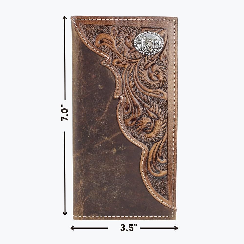 American Bison Tooled Side Rodeo Wallet with Conchos – Oil Pull Up – Durable, Stylish & RFID Protected (Kneeling Cowboy, Brown)