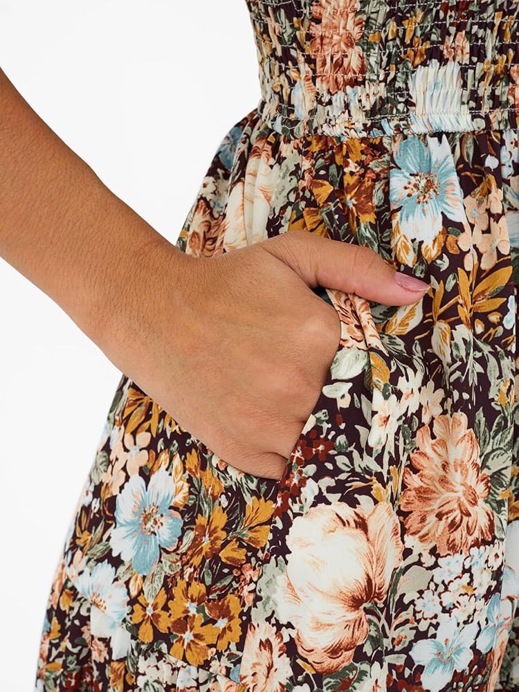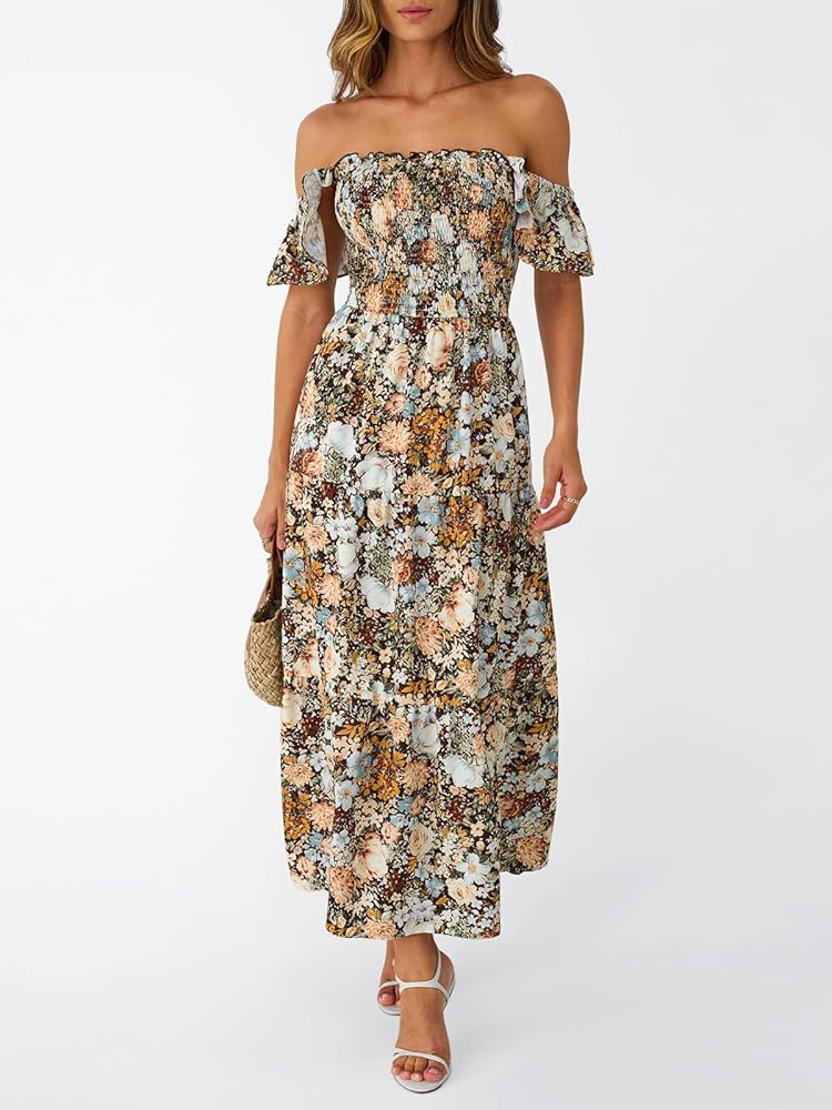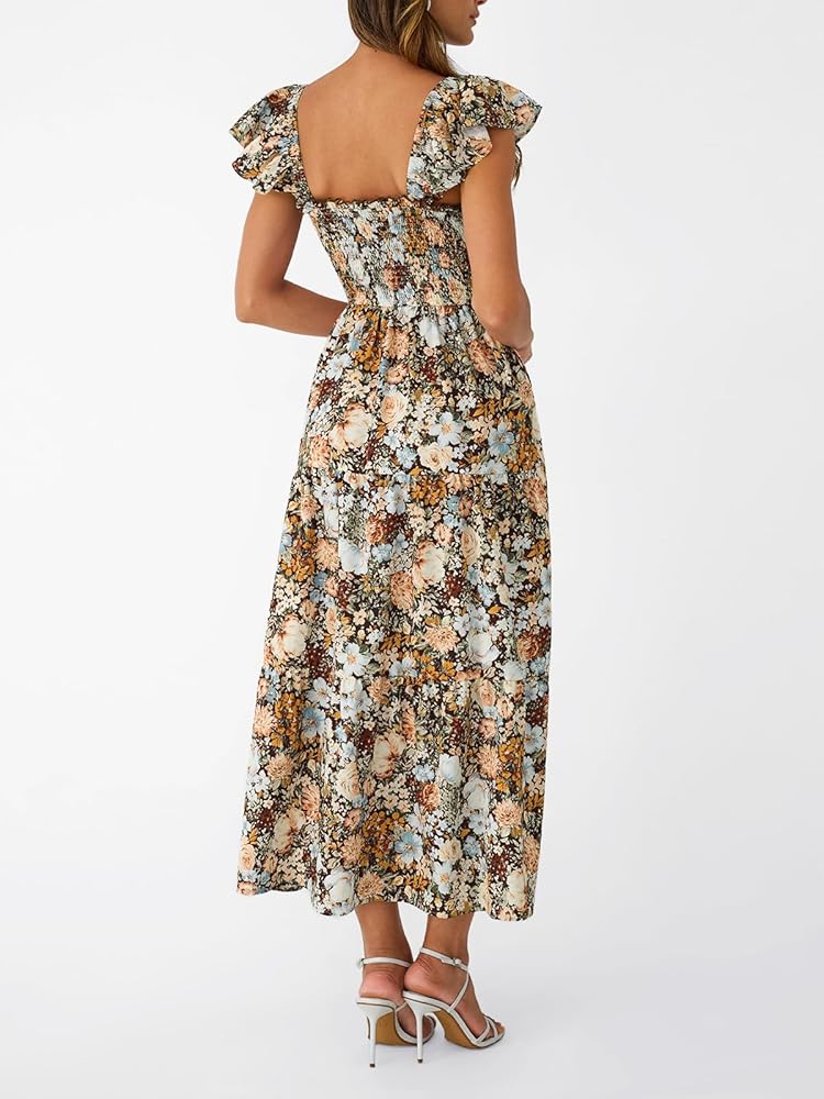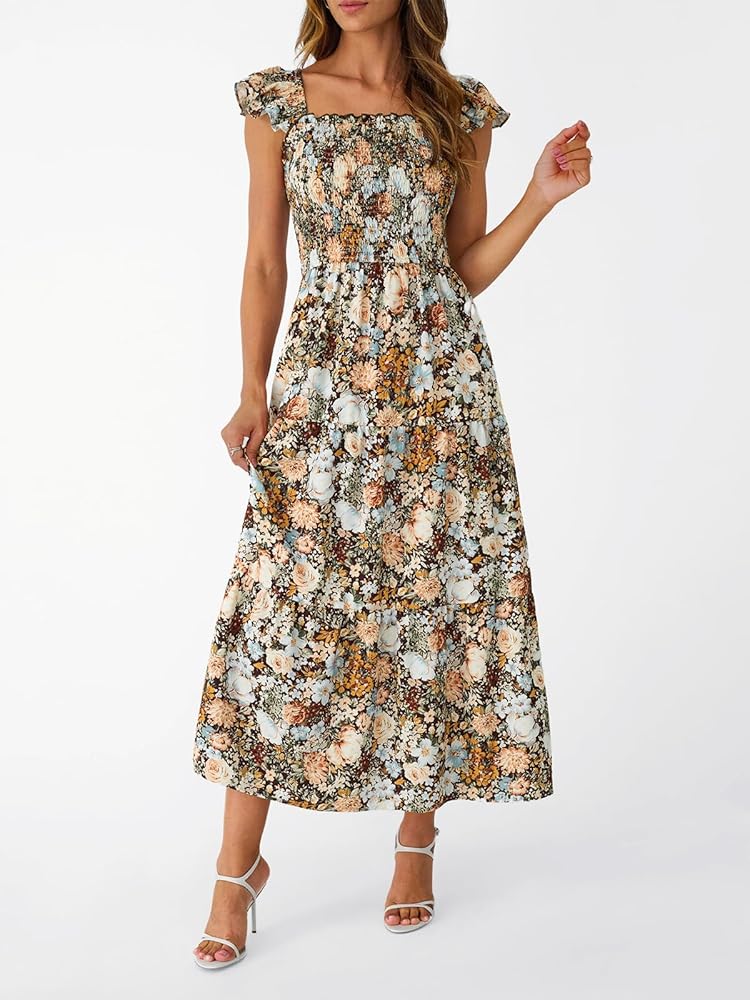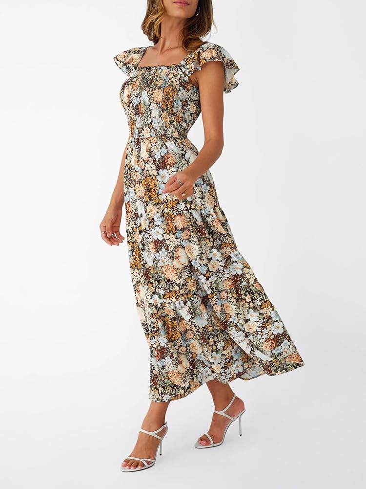Features: Maxi-length dress with delicate ruffle sleeves, square neckline, and allover floral print, adding a touch of sophistication, and a playful, feminine flair. The floral pattern features vibrant, garden-inspired blooms in a soft color palette, perfect for spring and summer seasons. Featuring a stretchy smocked design on the upper part and A-line cut on the lower part , it creats a flowy and graceful silhouette, ensuring a comfortable and flexible fit that adapts to various body shapes.