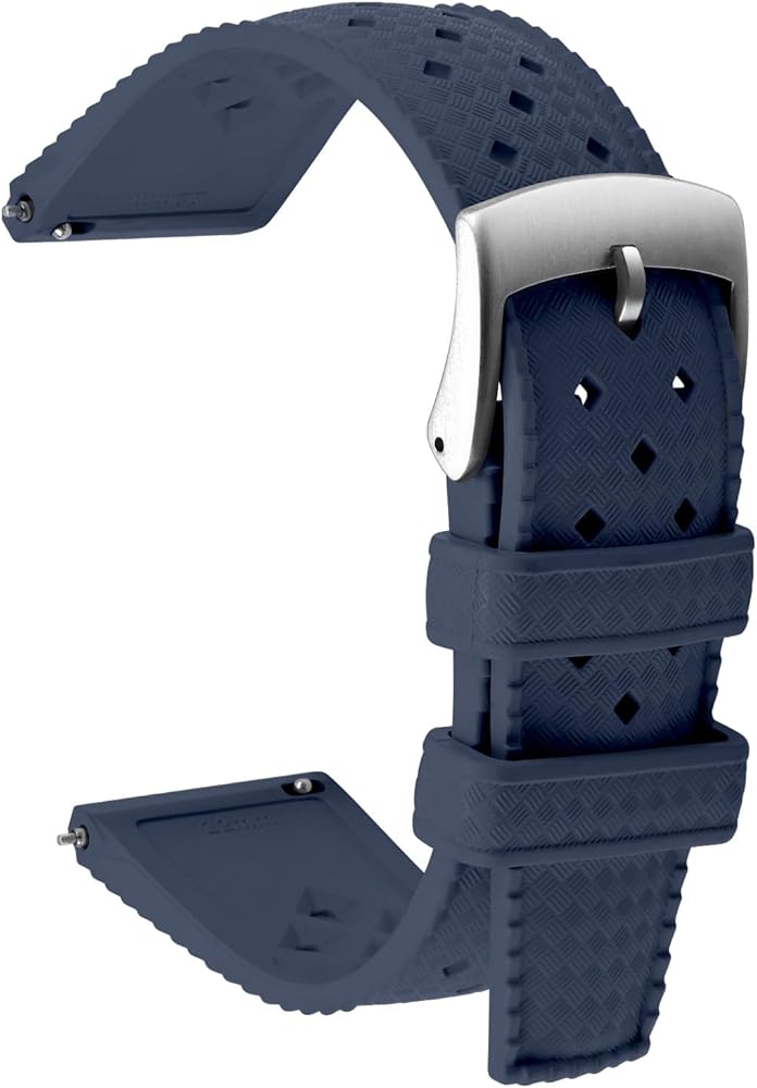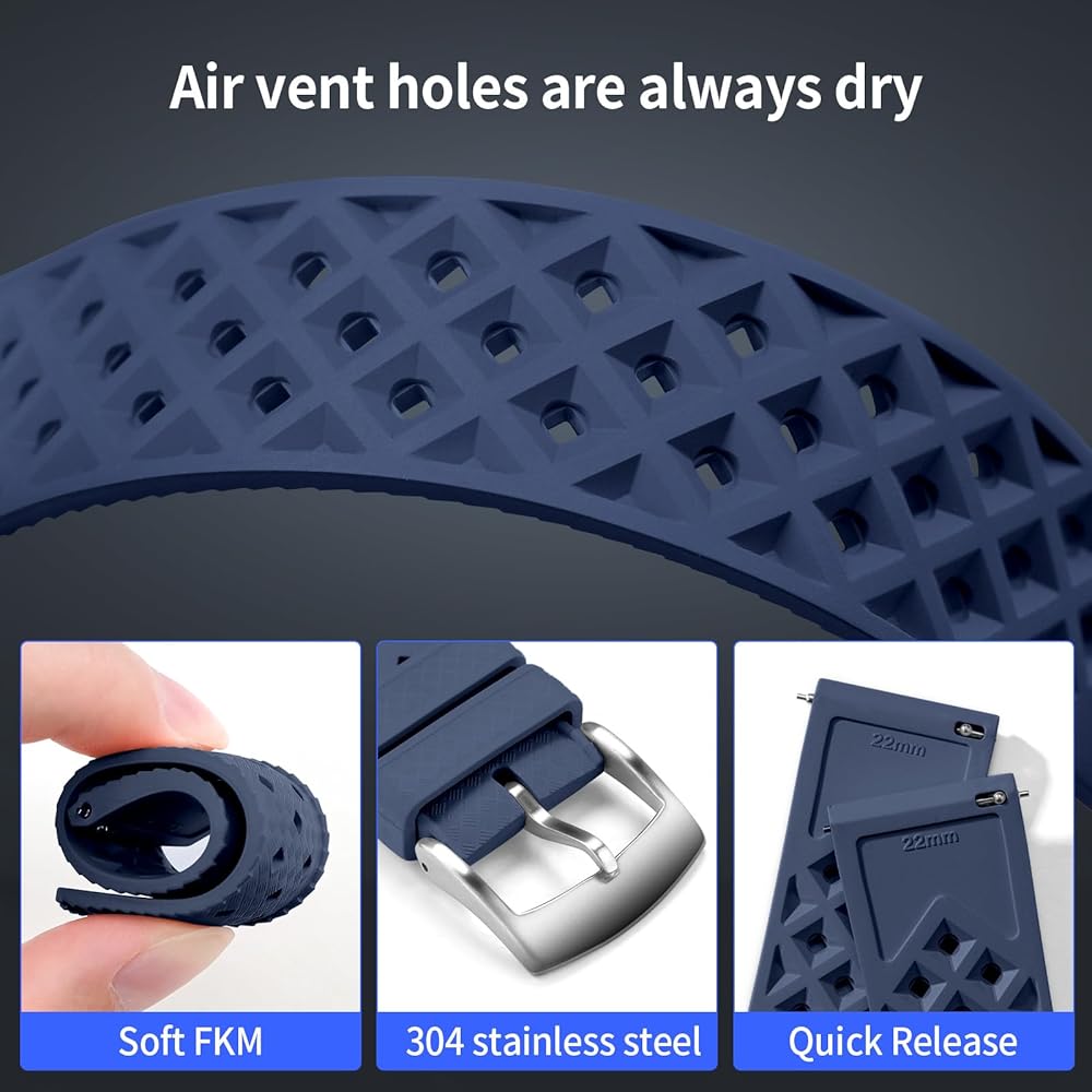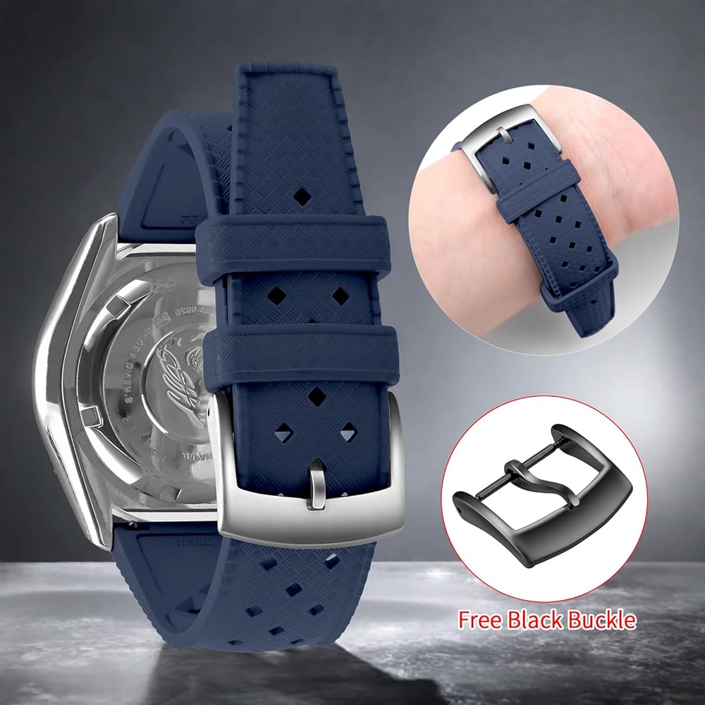 [Premium Material] This band is made of high-performance Fluororubber (FKM Rubber) with a polished stainless steel buckle. It has higher density than traditional rubber or silicone watch band on the market, is softer, more skin friendly and can be bent at will