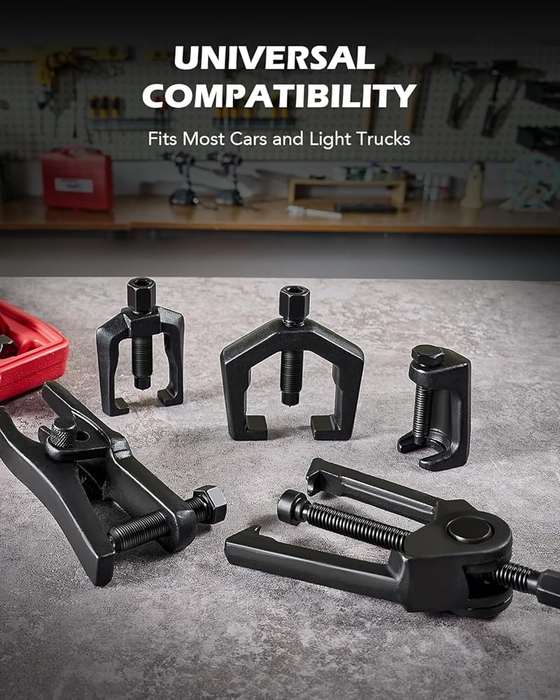 1 ALL IN ONE FRONT END SERVICE KIT: Containing 5 adjustable tools for a wide range of domestic and import vehicles. Comes with 1x Ball Joint Separator, 1x Tie Rod and Ball Joint Remover, 1x Conical Pitman Arm Puller, 1x Pitman Arm and Tie Rod End Puller, 1x Pitman Arm Puller, 1x well-organized ABS case.