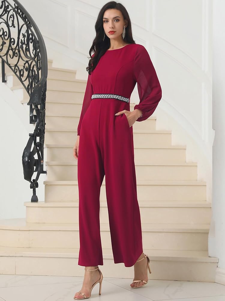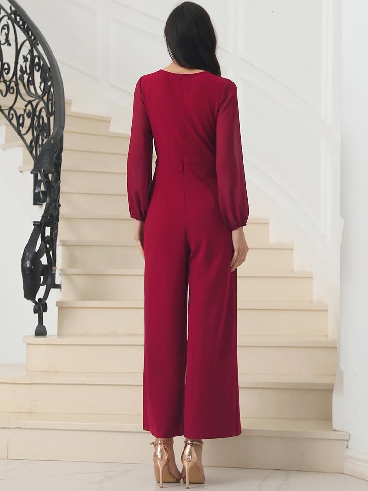 To be the shiny star in the crowd with Womlayout's cocktail long jumpsuit, featuring wide leg and semi sheer sleeve to show your charming.