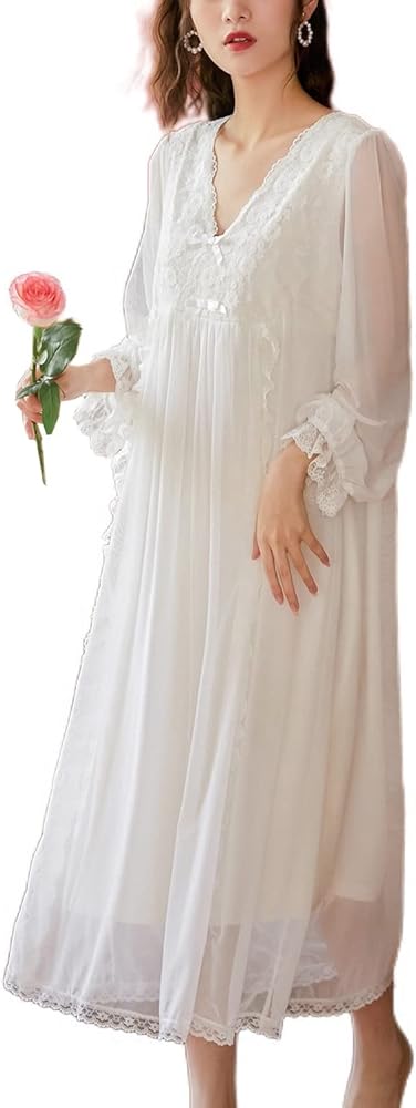 Homgro Women's Long Sleeve Nightgown Ladies Soft Cotton Long Victorian Sleep Shirt Princess Vintage Lightweight Lace Backless Strappy Backless V Neck Lounge Pajama Dress Sleepwear