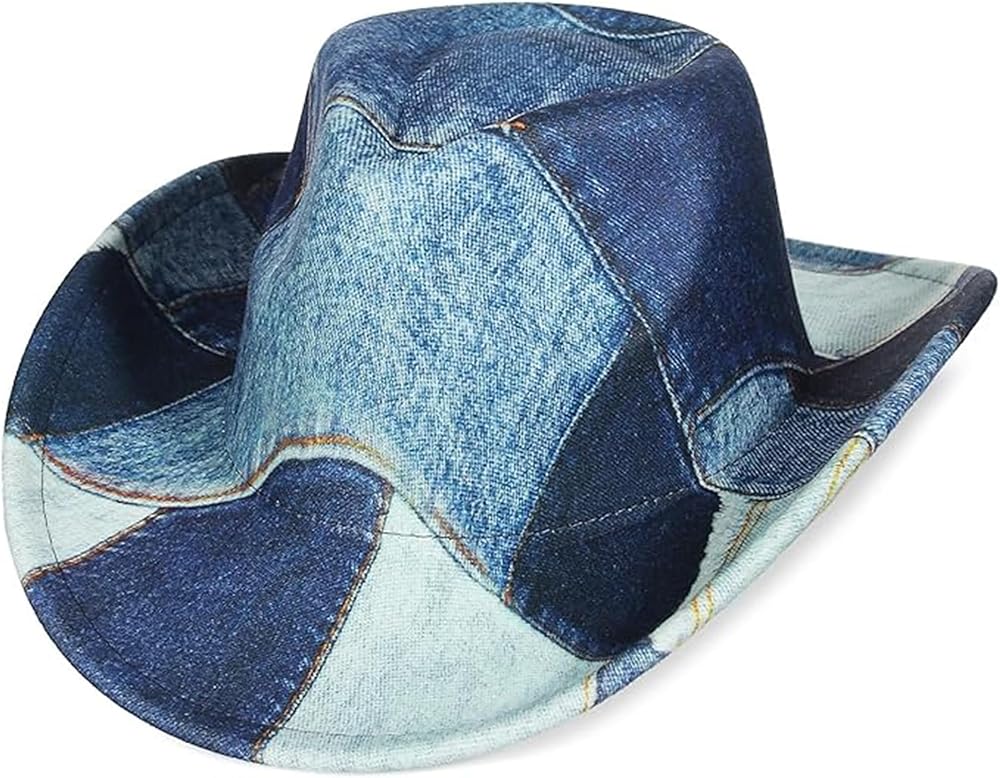 2. Unique Denim Patchwork Design:Our wide brim cowboy hat features a trendy and eye-catching denim patchwork print, combining rustic charm with modern fashion for a standout look.