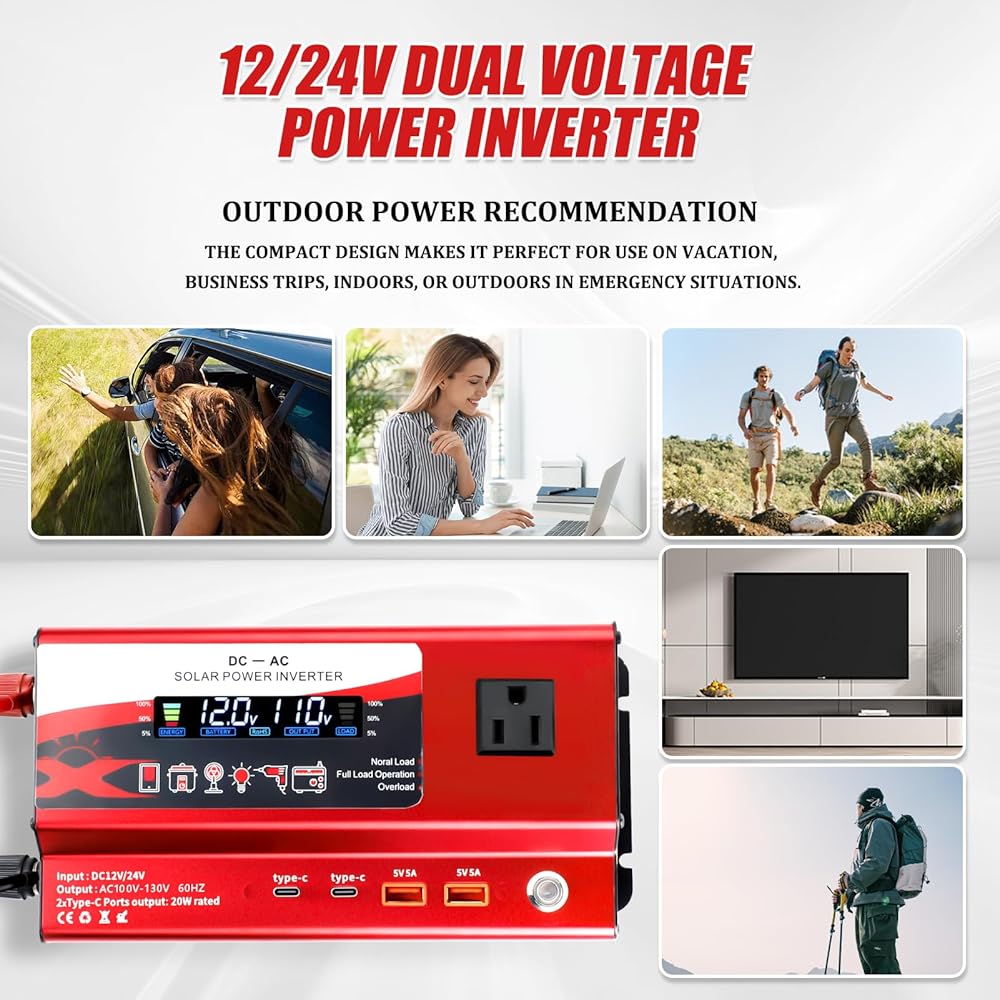 [Wide Range of Applications] The car power inverter is compatible with dc12v and 24v, suitable for small cars and large trucks, providing versatility for various vehicles and situations.