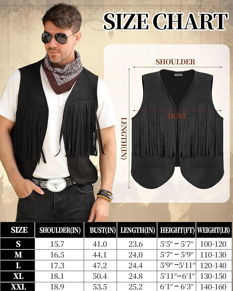 Suede Vest: Soft faux-suede exterior with breathable cotton lining ensures rugged charm without discomfort (inspired by classic rodeo wear).
