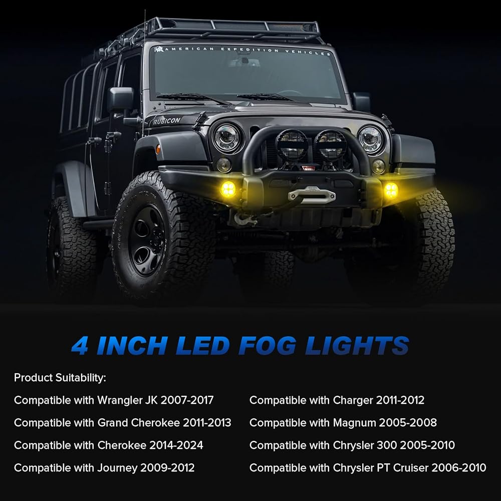 【Fitment】LED fog light compatible with Wrangler JK JKU 2007-2017, Grand Cherokee 2011-2013, Cherokee 2014-2024; Journey 2009-2012, Charger 2011-2012, Magnum 2005-2008; Chrysler 300 2005-2010, Chrysler PT Cruiser 2006-2010.