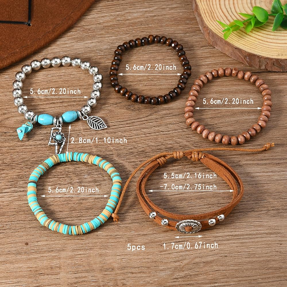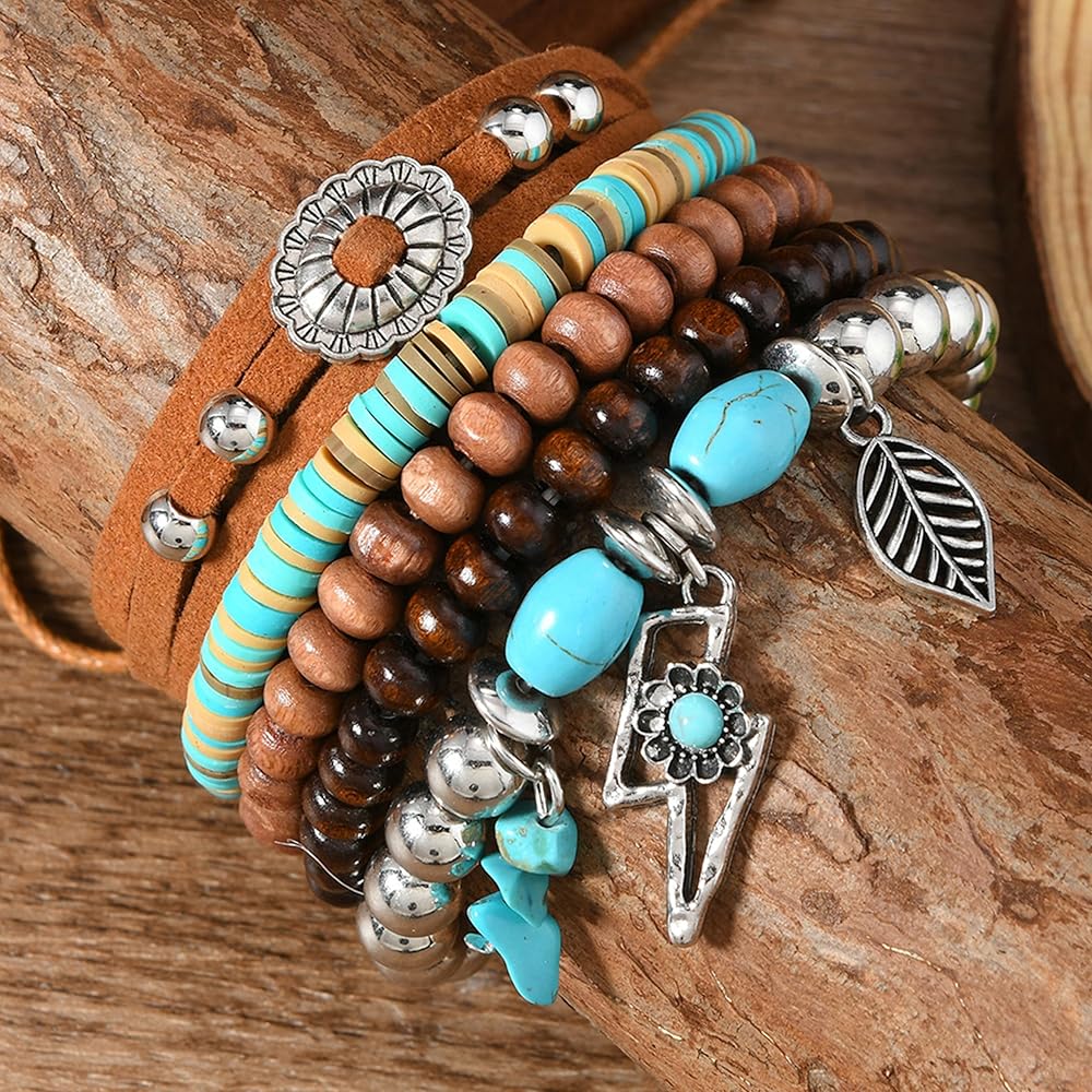 Western Jewelry: Complete your look with this set of stylish boho bracelets featuring an Aztec turquoise and Stackable Bracelets for a unique look.
