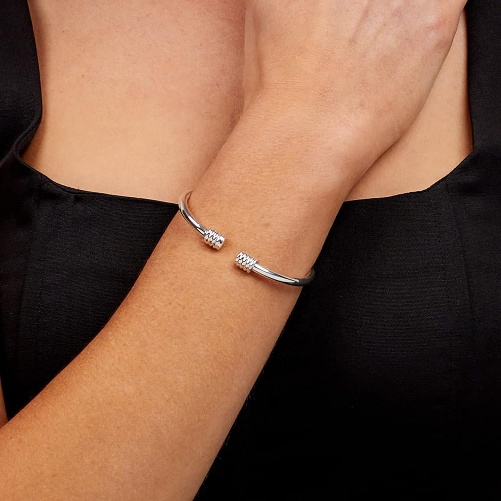 This statement men's silver bangle bracelet is made from quality 925 sterling silver. Measure from end to end is 17cm. Width: 4.5mm , End Balls: 7mm; Diameter: 65mm; Weight approx: 21.2grs ; 925 silver hall marked, One size fits most Wrist sized from 18.5cm to 23cm very simply with a gentle squeeze or pull to adjust the size. Presented in a beautiful jewellery gift box. It makes a great gift for him. Idea for Christmas gift, anniversary gift, father's day gift, valentine's gift and much more.