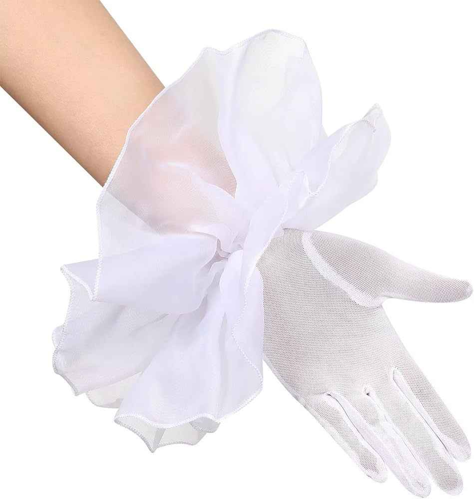 Size: This short oversize ruffle cuff sheer gloves are approximately 8.6 inches from the fingertips to the end of the glove. With certain extensibility, the pair of tulle gloves are suitable for most women's hands.