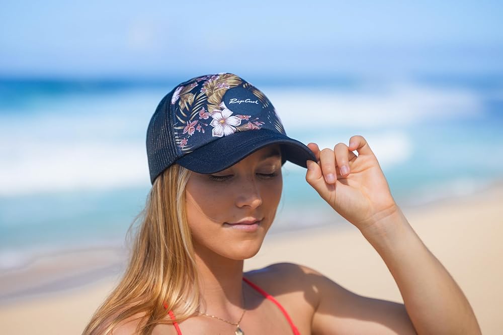 Embark on your next adventure with this Women's Trucker Hat by Rip Curl, your ultimate companion for the road. Made from 100% polyester, this trucker hat boasts a curved peak and a beautiful print, adding a distinctive flair to your look. The adjustable snap tab guarantees a personalized fit, while the recycled polyester mesh provides breathability, keeping you cool during those warm summer days.