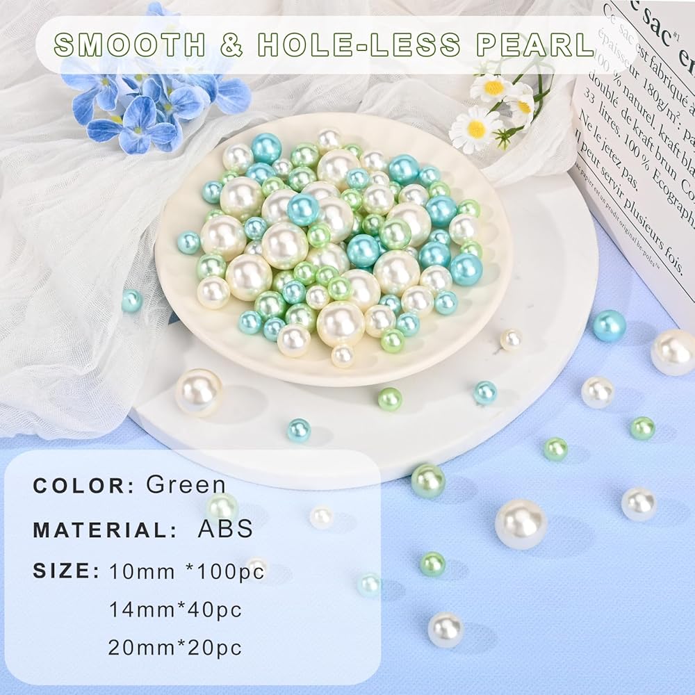 U-LIAN Green Floating Beads for Centerpieces, 160PCS No Hole Faux Pearls and 3000PCS Water Beads for Vase Filler, Round Glossy Polished Bead for Table Scatters, Wedding Party, Home Decor, 10/14/20mm