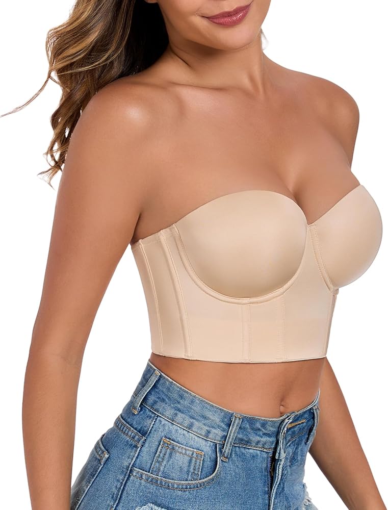 Longline Bustier Style: This strapless bustier bra features full-coverage molded cups and a long underband for added support. Its seamless and smooth design ensures it looks invisible under tight t-shirts while providing a well-rounded and shapely appearance.