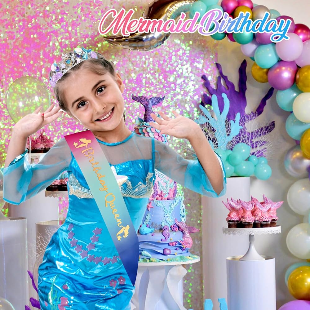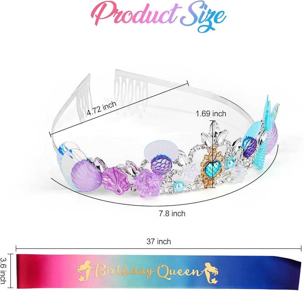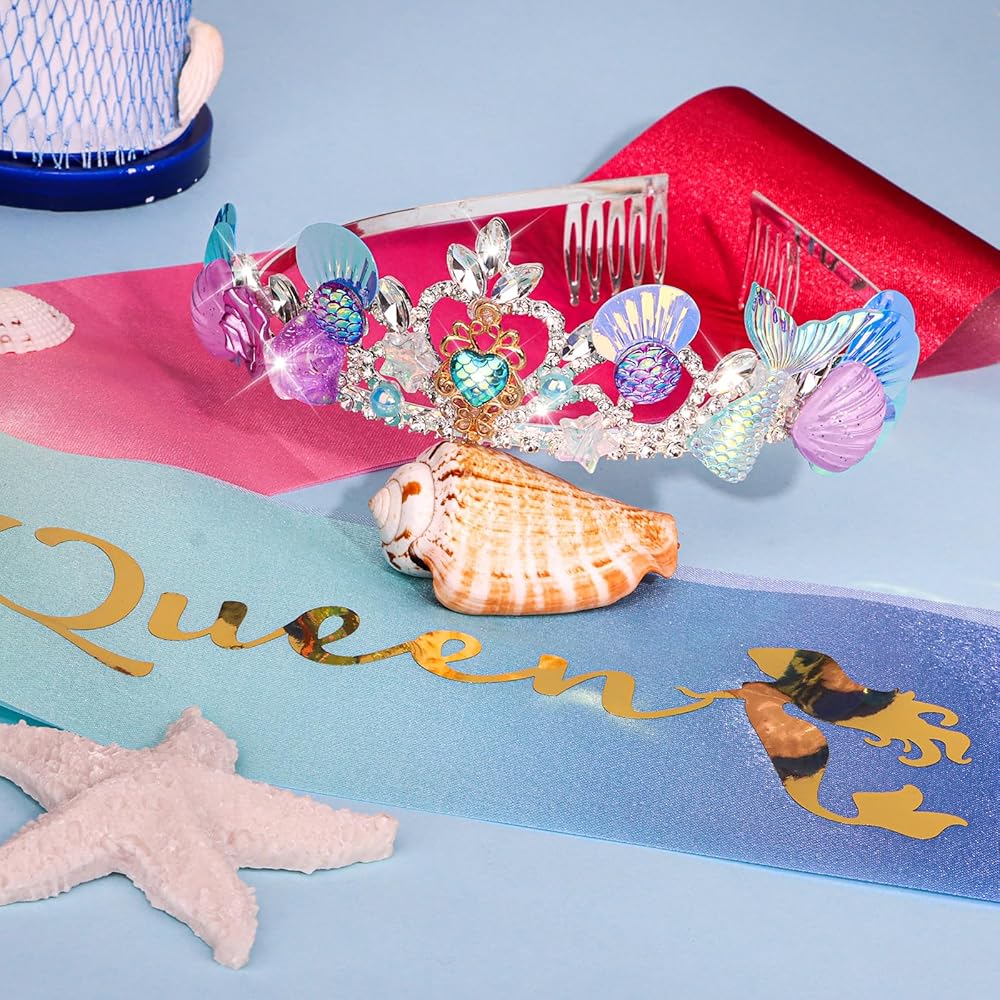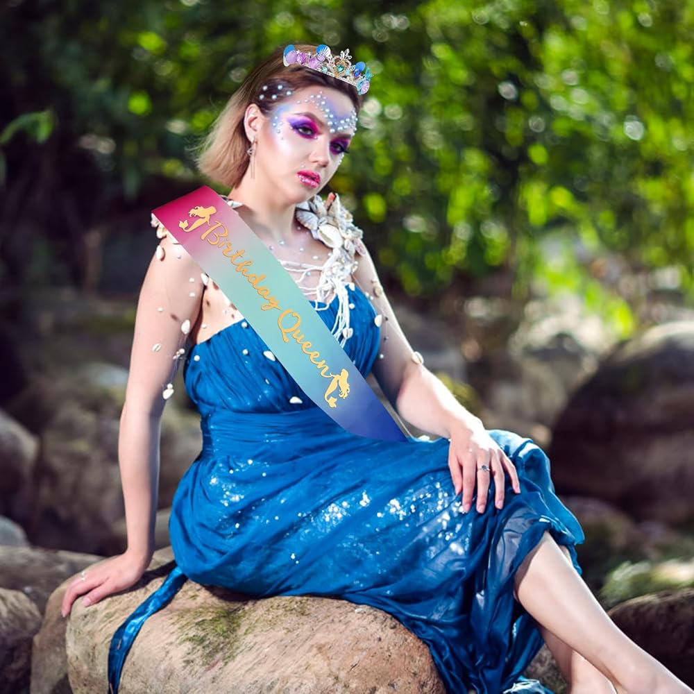 CIEHER Mermaid Crown and Birthday Queen Sash for Women Girls: Mermaid Birthday Decorations - Crown and Sash Set - Multi-colored - Unisex-Adults & Youth Girls