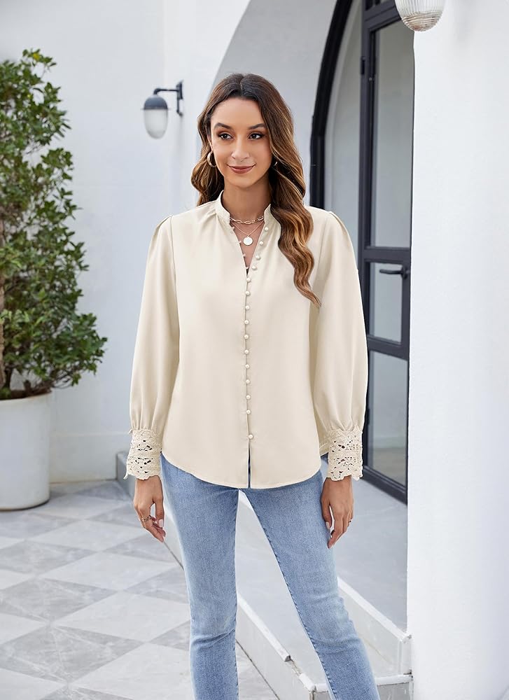 Design: This womens blouses are crafted with meticulous attention to detail, lace cuff patchwork adds a elegance and delicate feeling, featuring front buttons that can be fastened to create band collar tops, and unbutton 7 button to create a deep v-neckline, elegant and unique design, make you very fashionable for work and daily wear, it's an essential item in every women wardrobe