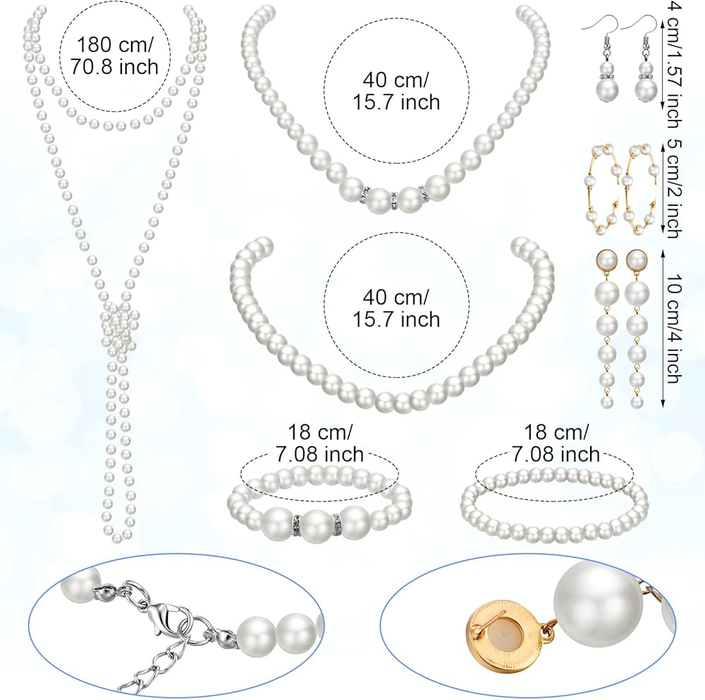 The faux pearl jewelry set includes 3 pcs pearl necklace, 2 pcs elastic beaded bracelets and 3 pairs of dangling pearl earrings.