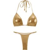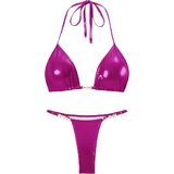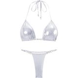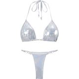 FEATURE: This glitter bikini set features metallic fabric which creates a glamorous look. The flattering triangle cups offers great comfort and support. The halter neck tie ensures adjustability while enhancing your neckline. Adding to its charm are exquisite pearl decorations that give this bikini a unique and elegant touch. The strap of the matching bottom is adjustable, offering a perfect fit.