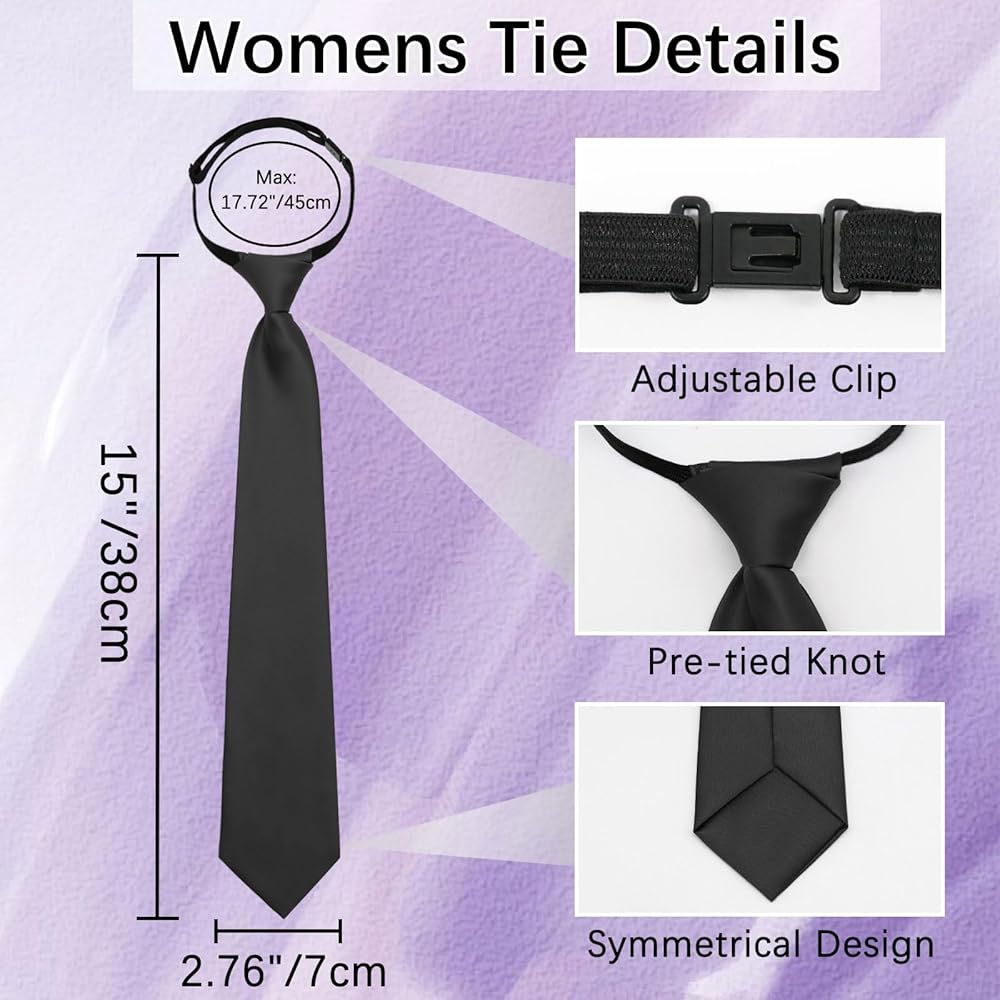 Clip On Tie For Women: Say goodbye to the tedious knotting process; With this pre-tied ties for women, you can have a professional look without any effort; The adjustable neck size ensures a comfortable and perfect fit for everyone