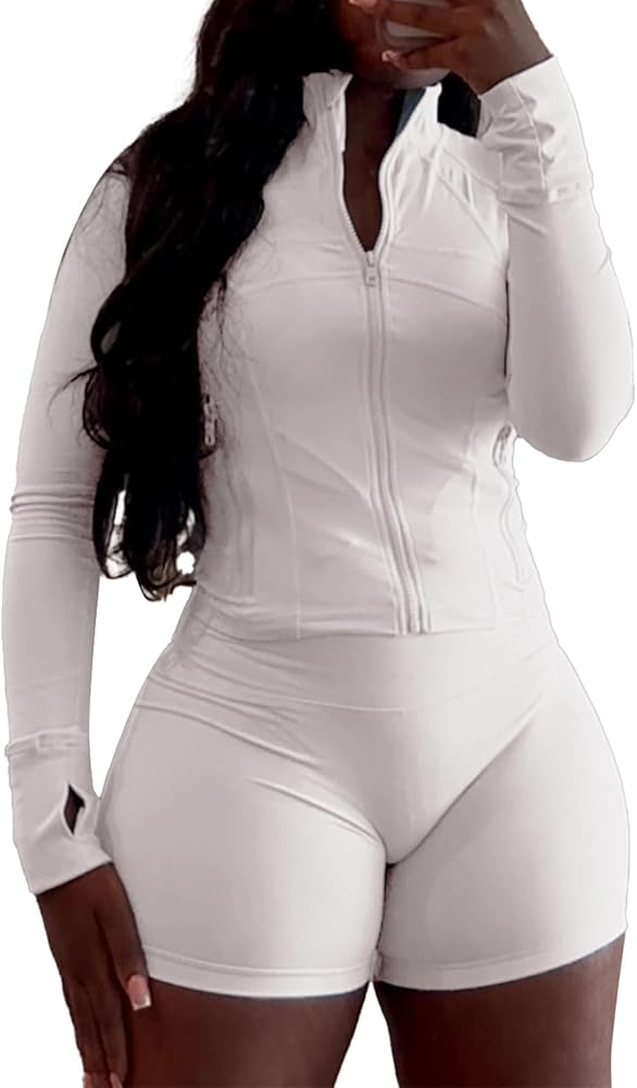 Features: The slim cut and curvy fit make these sets perfect for streetwear or casual bodycon looks. Fashion stand neck, thumb holes, elastic high waist, stretchy short sets make you cute and fashionable. Designed with tummy control wide waistband contours your curves and shape your body. The classic and trendy design elevates your summer look