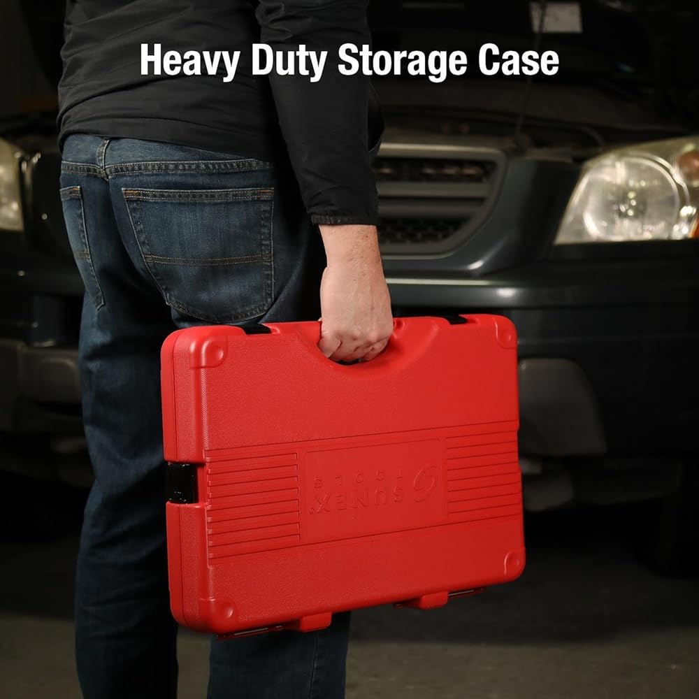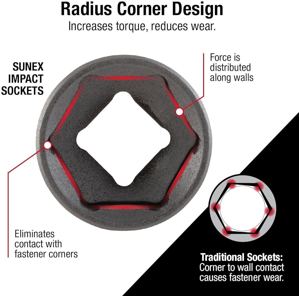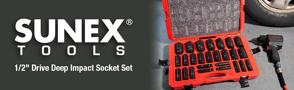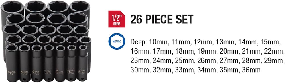 This Sunex 1/2 inch deep drive 26 piece metric impact socket set includes the most common sizes used for automotive repair. It includes 26 metric sockets. It is made of CR-MO alloy steel for long life. It is fully guaranteed and includes a heavy duty blow molded storage case. Set includes in metric mm: 10,11, 12, 13, 14, 15, 16, 17, 18, 19, 20, 21, 22, 23, 24, 25, 26, 27, 28, 29, 30, 32, 33, 34, 35, 36.