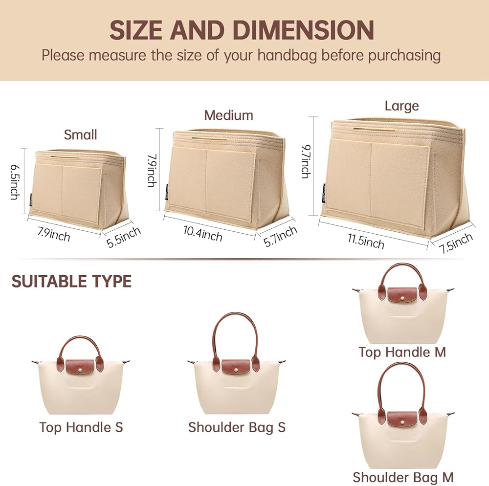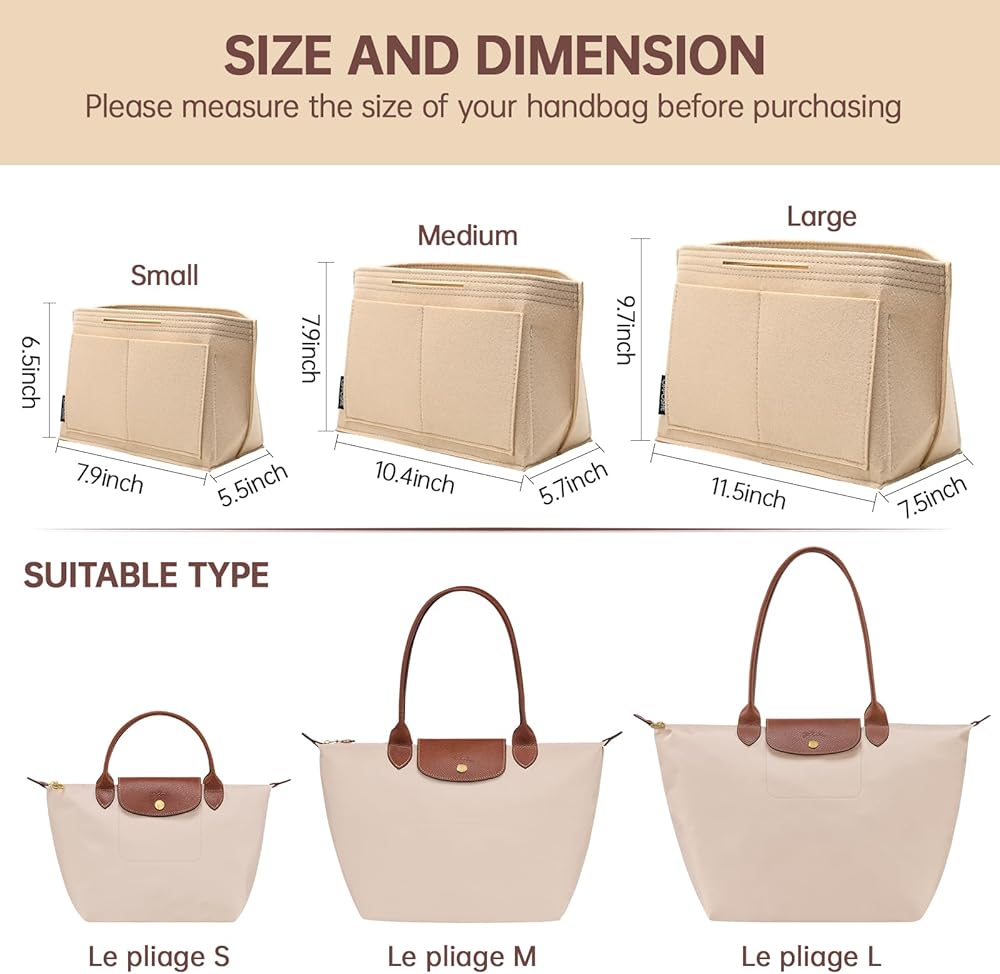 الأبعاد والتوافق: تم تصميم هذا المنظم المحفظة لتناسب سلسلة Longchamp Le Pliage وأكياس متشابهة الحجم. يرجى تأكيد أبعاد حقيبتك الداخلية قبل الشراء. S: 7.9 "L X 5.5" W x 6.5 "H ؛ M: 10.4" L X 5.7 "W x 7.9" H ؛ L: 11.5 "L X 7.5" W x 9.7 "H