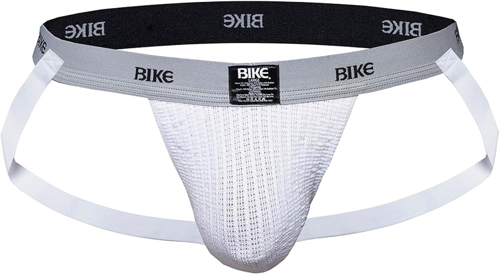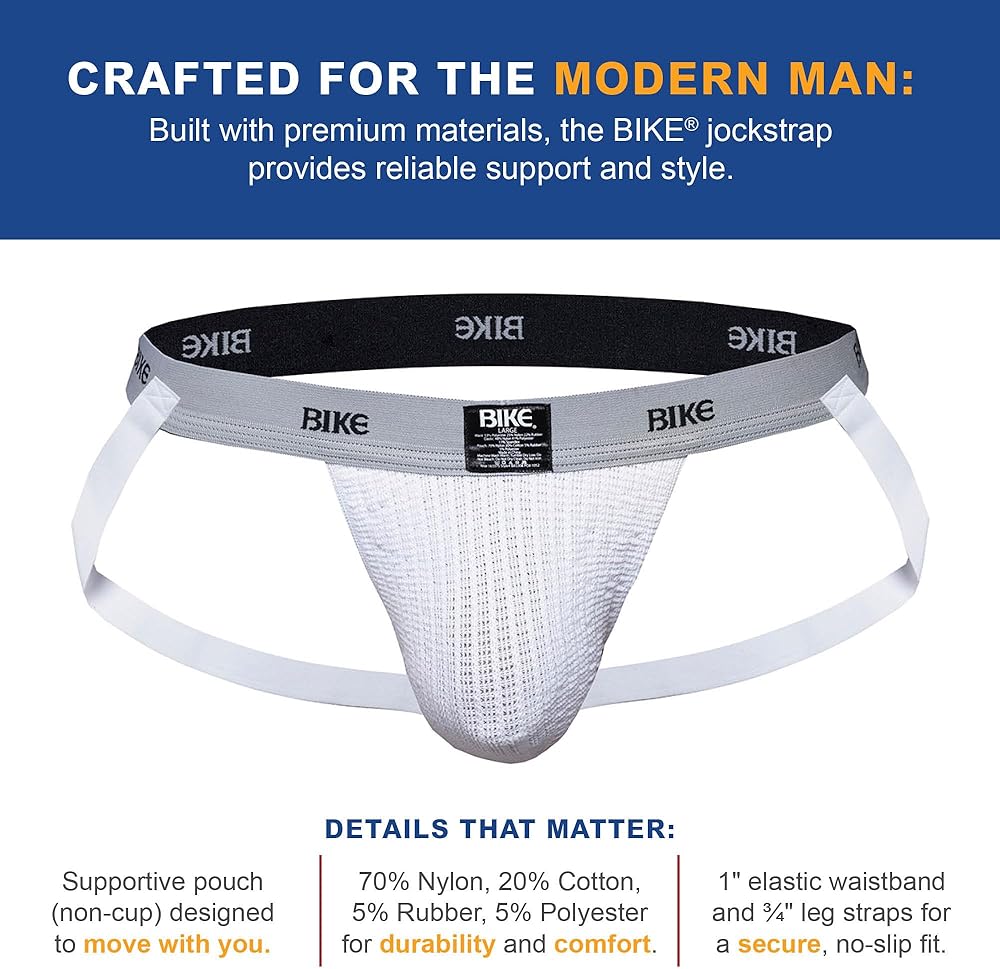 Experience comfort and style with our BIKE Athletic Jockstrap, designed for active individuals. This low-rise, white jockstrap features a 70% Nylon, 20% Cotton, 5% Rubber, 5% Polyester fabric blend, offering durability and moisture-wicking capabilities to keep you dry during intense workouts. The 1' wide elastic waistband and 3/4' leg straps ensure a secure fit, while the low swimmer cut provides discreet coverage. The signature BIKE Athletic logo is prominently featured on the waistband. Machine washable for easy care.