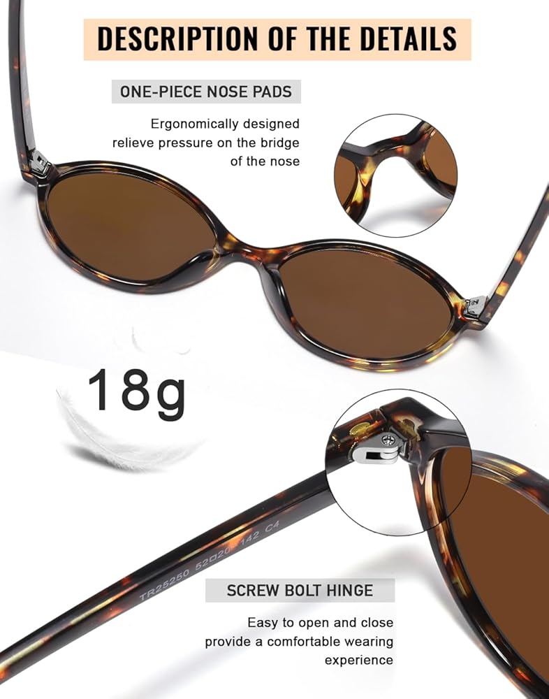 【RETRO OVAL SUNGLASSES】Retro Sunglasses features a unique 90s oval design with metal rivets on the sides, exquisite and compact, cute and fashionable, suitable for various face shapes.