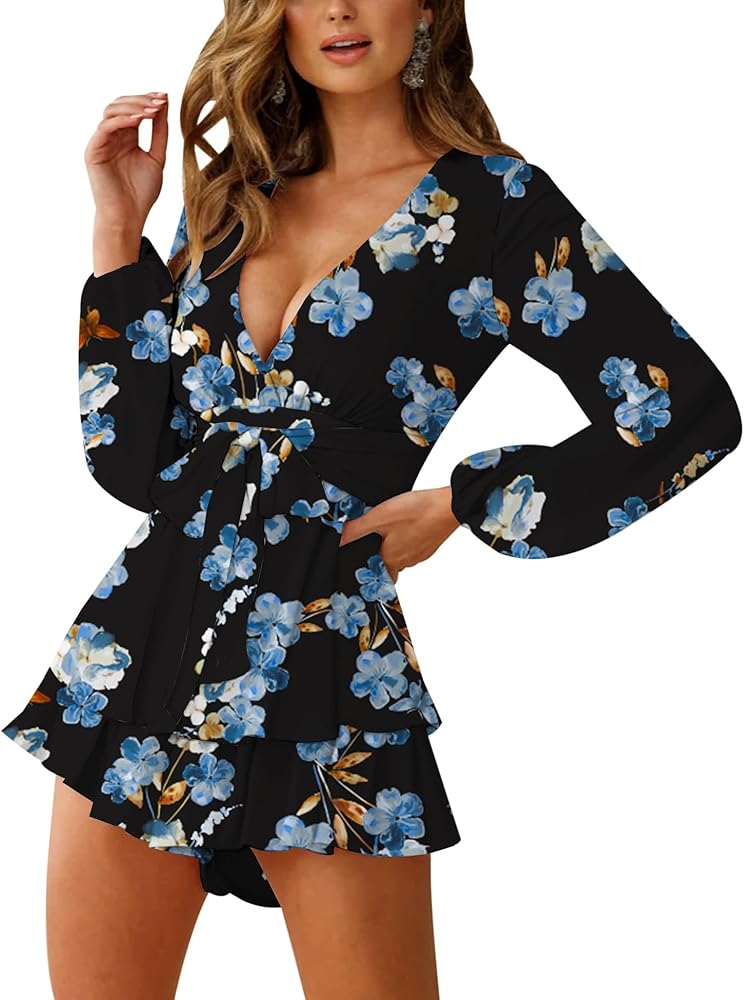 Features: Women's summer casual romper jumpsuits/Deep v neck sexy summer rompers/Waist tie knot rompers jumpsuits/Layered ruffle hem summer short romper/Swing rompers for women/Back zipper rompers/Women's casual summer rompers jumpsuits/Flowy rompers/Romper for women 2025.