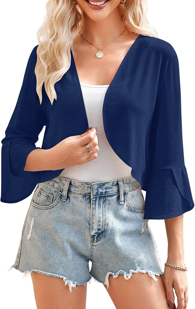 Features: Womens shrug cardigan, 3/4 ruffle sleeve, short kimono cardigan, lightweight summer cardigans, bolero shrugs for dresses, cropped cardigan, sheer cardigan for women.
