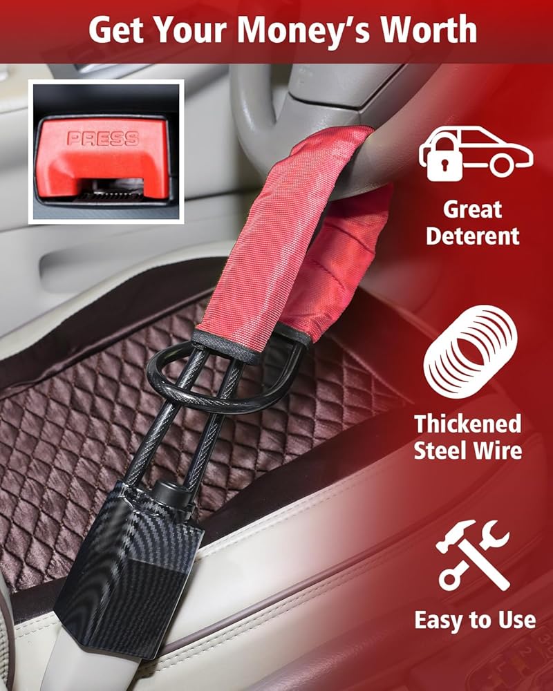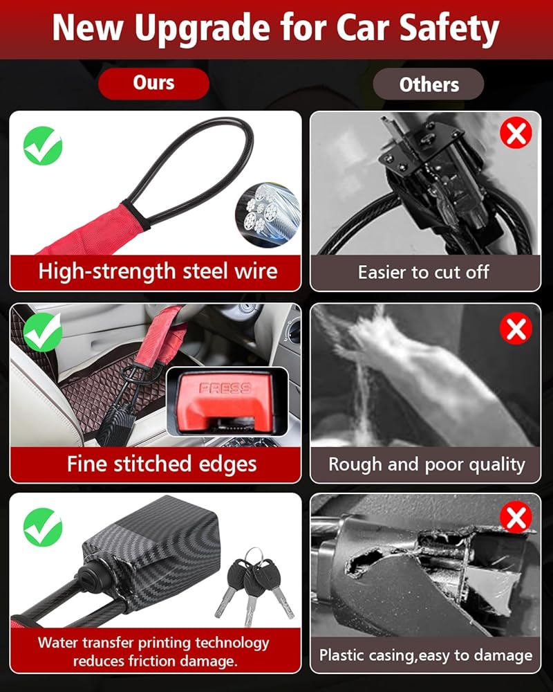Steering Wheel Anti-Theft Lock, suitable for most vehicles with seat belt buckles, sturdy and durable, suitable for cars, trucks, suvs, truck seat belts, 3 keys, high-quality materials make it a more durable car lock. steering wheel anti-theft lock is made of high-strength braided steel wire, 5mm thicker than others, up to 28 inches long, can withstand high tension and shear force, provides higher strength and flexibility. eye-catching color and sturdy car anti-theft device has a very effective deterrent effect, will give thieves who try to steal your car a headache, stay away from your car!