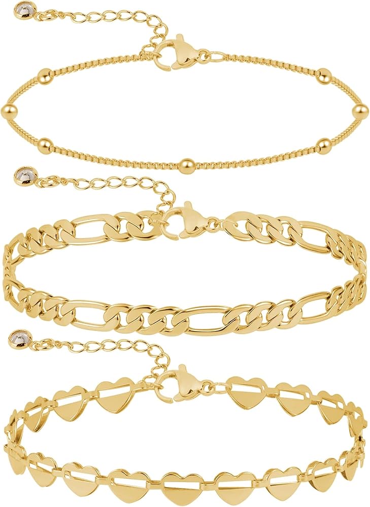 LEXODY Gold Ankle Bracelets for Women Waterproof, 14K Gold/Silver Plated Layered Beaded Heart Anklets for Women Trendy Dainty Cuban Link Chain Anklets Set Summer Beach Jewelry Gift
