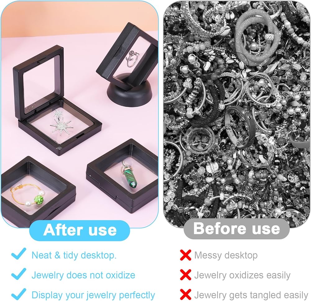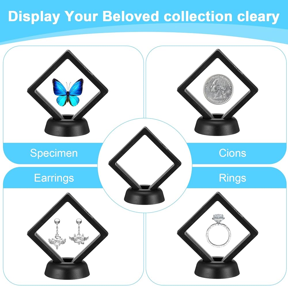 Showcase your treasures in style with our 30-piece floating display case set. These 3D floating frame display cases create an eye-catching floating effect for jewelry, coins, and collectibles. Each floating display includes a sturdy base and measures 2.7" x 2.7" x 0.8" (7x7x2cm). Made from durable polyethylene with crystal-clear film, these floating display stands protect while displaying your items beautifully. The 3D floating frame design works perfectly for rings, medals, fossils, and other small valuables, making them ideal for collectors and jewelry enthusiasts alike.