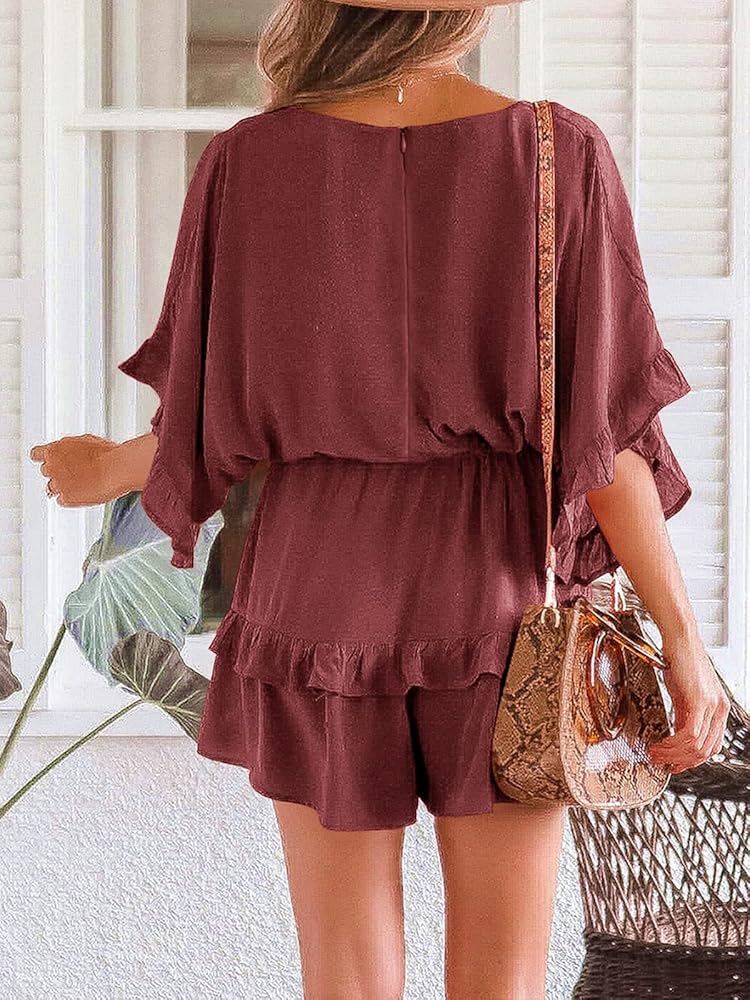 - It features deep v neckline, batwing sleeves with ruffle trim, elastic high waist, flared wide leg, back zipper.