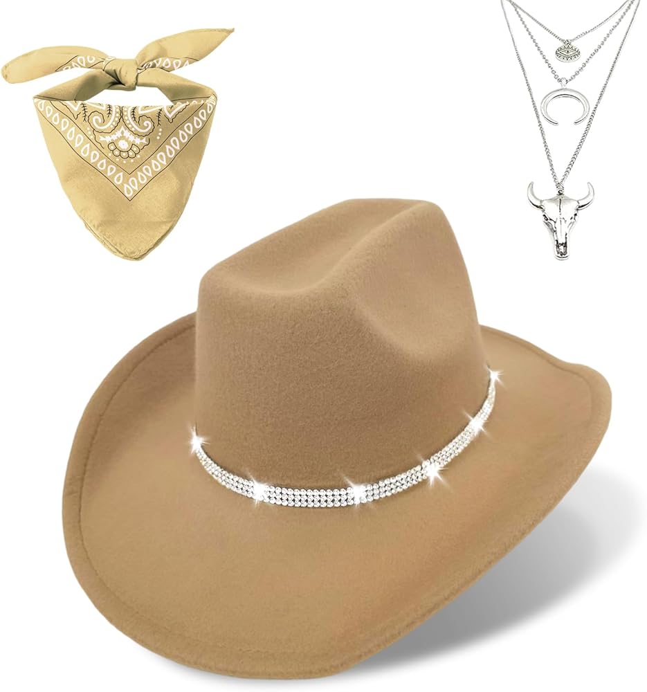 Sleek Felt Cowboy Hat with Layered Necklace: The perfect Western cowboy outfit set, featuring various hat styles with embellishments such as rhinestones, belts, bullheads, and more. Multiple western hat styles for you to choose from. The classic felt womens cowboy hat pairs seamlessly with the Western cowboy necklace, capturing the essence of the Wild West