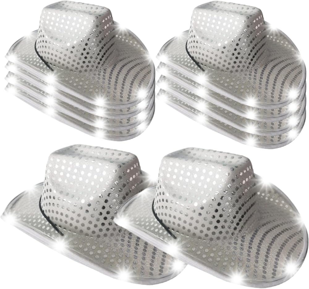 CUTE & COMFORTABLE: This stunning silver light-up cowboy hat is the perfect accessory for your wedding celebration! The sequin-covered surface shines brightly day and night, adding an extra touch of fun and sparkle to your wedding day. It's not just a hat, it's an experience!