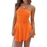 Fashion ruched strapless tube mini dress sleeveless backless off shoulder tiered layered ruffle hem a-line short dress for women.