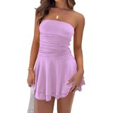 Features: Ruched strapless bandeau tube mini dress for women, sleeveless backless mini dress, ruched hem strapless short dress, off shoulder open back dress, ruffle hem a-line mini dress, ruched layered tube mini dress, pleated layered party dress for women, summer casual mini dress, tube dress, short sundress, sexy and elegant.
