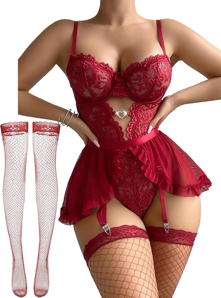 {Unique Design} Sexy lingerie set for women features lace cups with underwire, adjustable shoulder straps, croset lace top, sheer mesh skirt with ruffle hem attached underneath, elegant design of this lingerie dress makes it perfect for special occasions or simply feeling glamorous at home