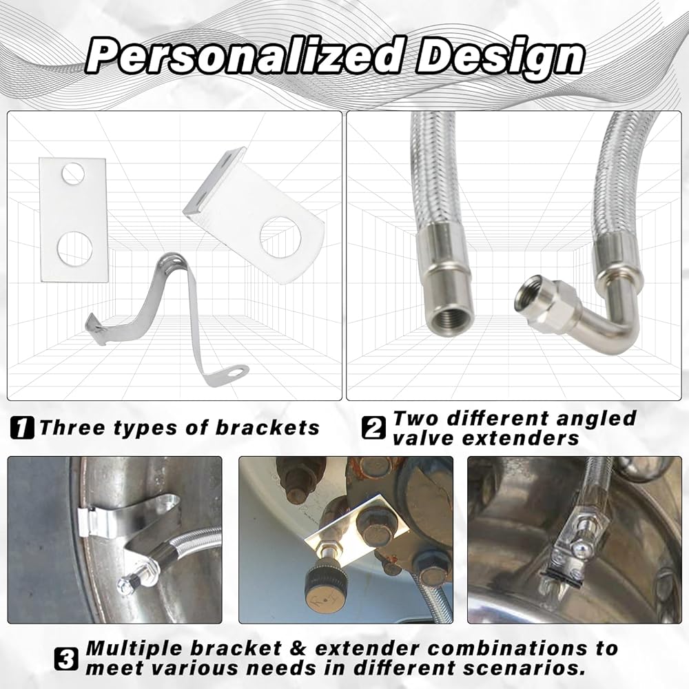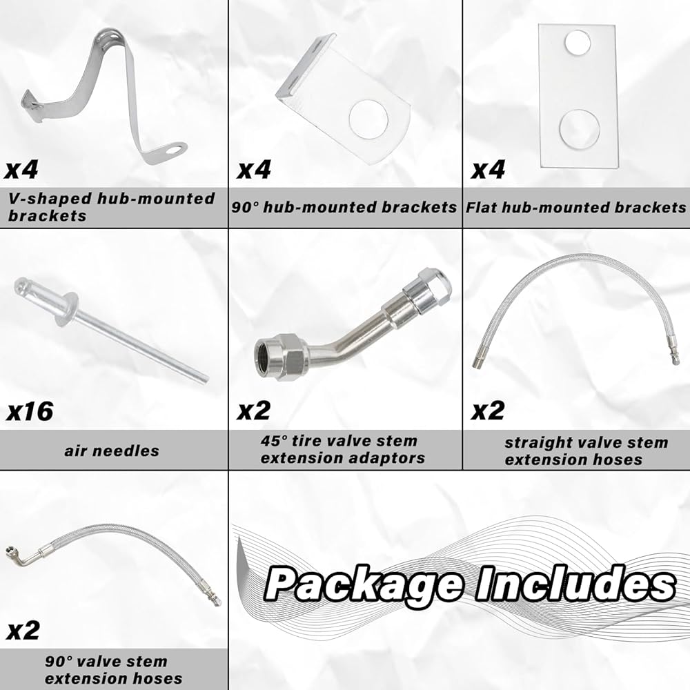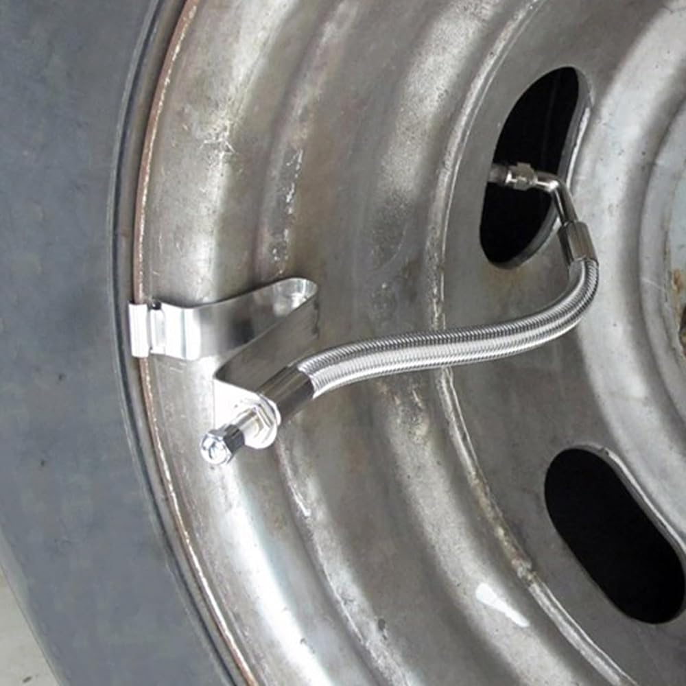 【EASY TO USE】: This kit can easily connect tire valves and equipment. Relocates inner tire's valve stem to outer wheel and extends valve stem on outer tire.Suitable for car and various truck tires, for use with most dual wheels with 1 1/16" and smaller hub nuts, includes brackets for most dual wheels with 1 1/16" and smaller hub nuts.