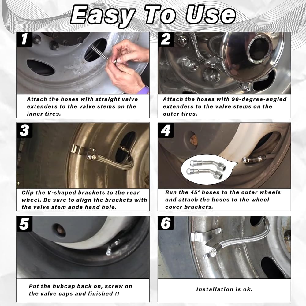 【FUNCTION】: This kit lets you easily check air pressure and inflate your vehicle's dually tires,the valve stem extension adapter is well compatible with most tire valves of inner and outer tires from 16"to 19-1/2".