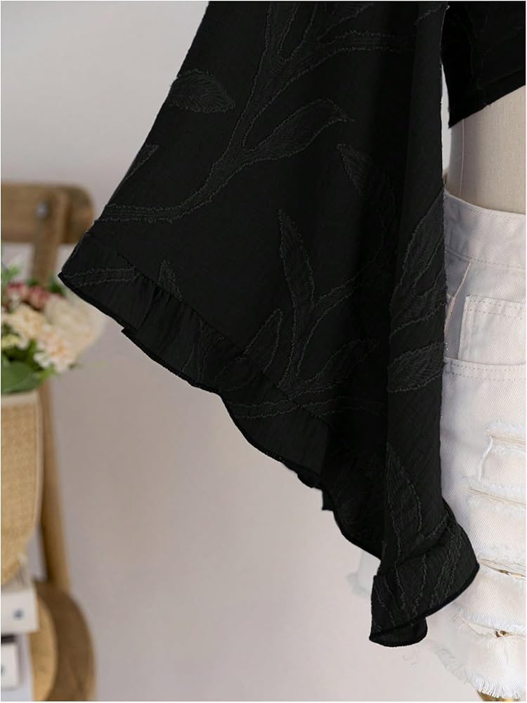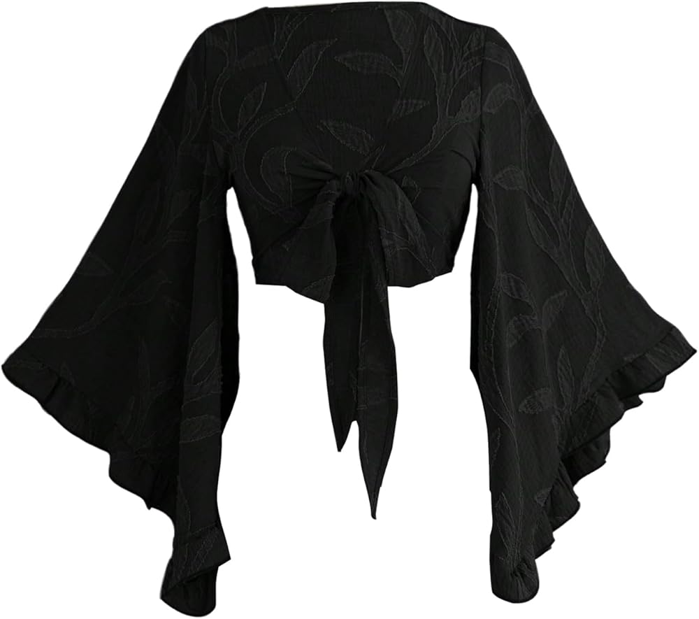 Feature: Floral print, ruffle trim, bell sleeve, long sleeve, tie front, V-neckline, cropped length, casual crop top blouse, making you look nice and pretty.