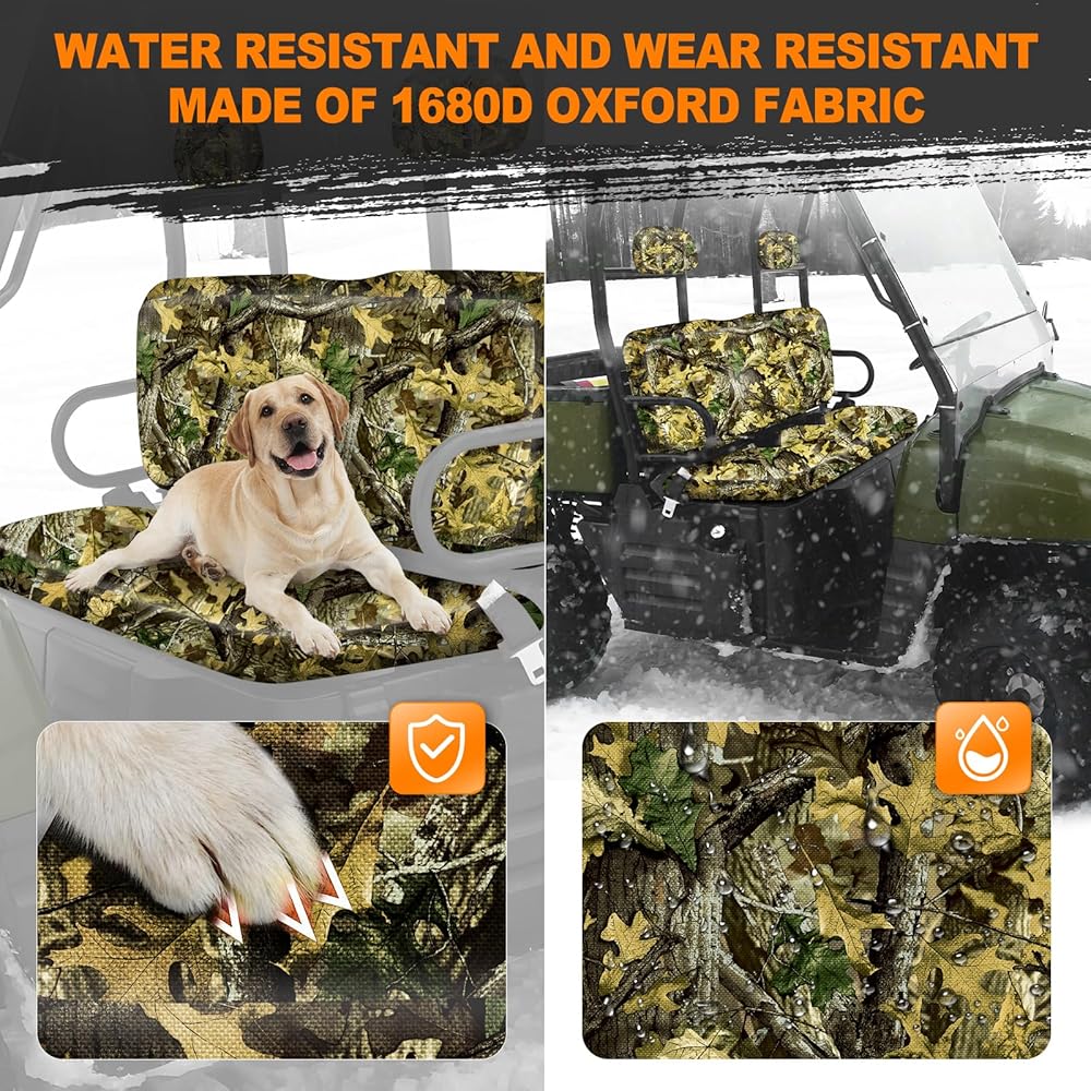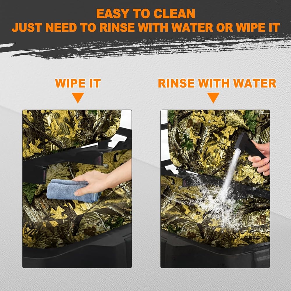 Easy to Install and Clean: You can install the UTV seat cover in a few minutes! Just put the camo seat cover on the front seat, adjust the elastic hem, and buckle up. The camo seat cover is made of 1680D fabric that is dust and stain resistant and easily cleans stains with a damp towel.